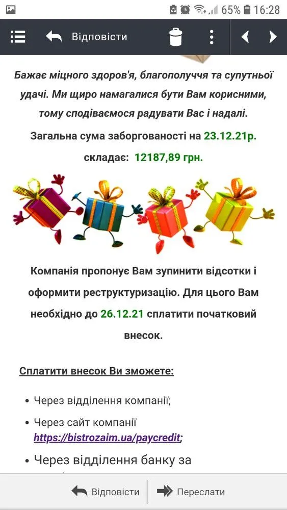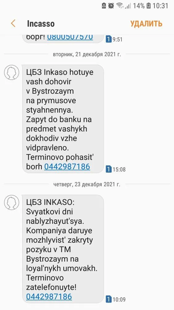 Добрый вечер дорогой форум, для начала поздравляю всех Вас с наступающими праздниками и пусть все задуманное сбудется. А теперь к делу, нужен совет, есть договор по БЗ на 7 тыс, с первого дня включен шикарный и действующий режим, так же с первого дня приходят СМС от Incasso разного бредового и смешного характера, звонки мне и контактному которые блокируется программой , вот что сегодня пришло прикреплю ниже, и что скажете, ждать дальше чего-то лучшего или звонить договариваться? Закрыть намерен.