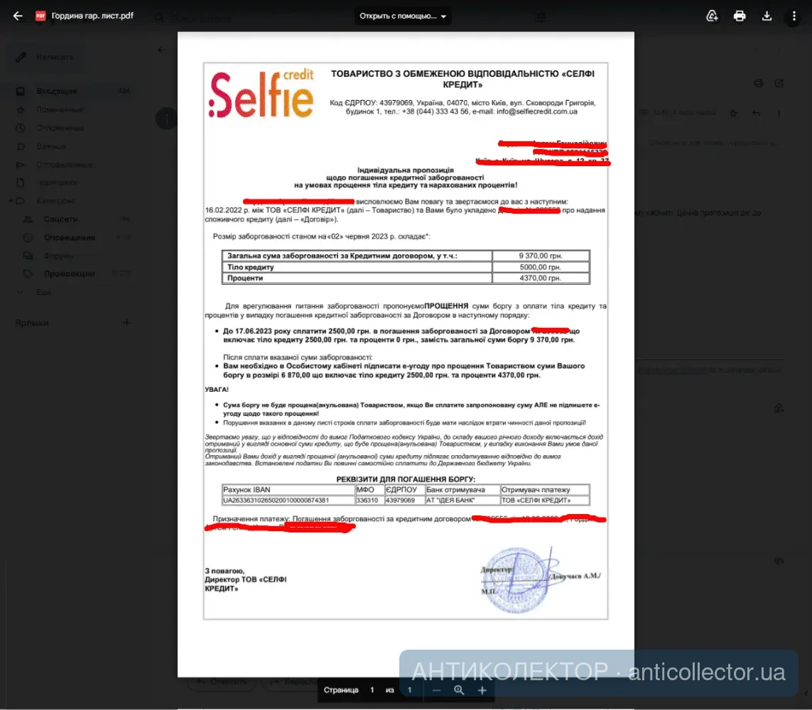 В п'ятницю побачив на пошті інформацію від SELFIE CREDIT - пропозицію закрити кредит за 50% від тіла. Попросив гарантійку. Гарантійку вислали, але там є дивний пункт. Після оплати потрібно підписати якийсь Е-договір про прощення суми та процентів. До того ж - у гарантійці написано, що якщо я навіть заплачу і не підпишу той документ, то в результаті кредит не закриють.