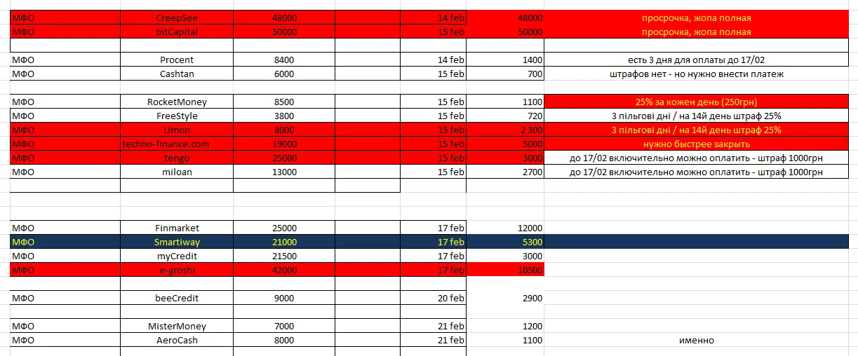 Я просто не знаю що робити , у мене є Exel файл з записами коли скільки платити.. і перераховувати нема сенсу, просто викладу найближчі дні яка ситуація.