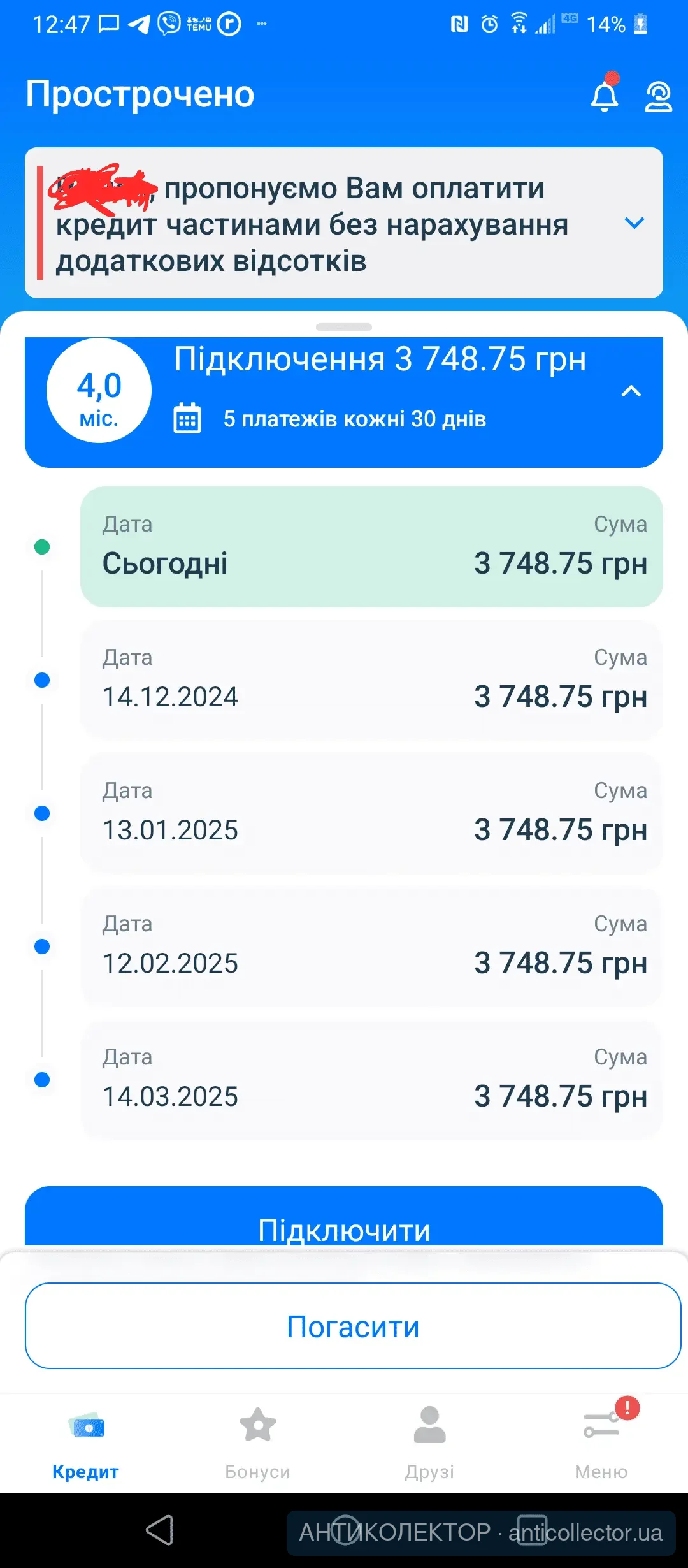 Сьогодні my credit запропунував реструктуризацію,мені б тільки дати по платежам змінити і все б влаштовувало,хто знає скільки приблизно ця пропозиція буде дійсна?З 14000 заплатити 18000 я готовий,не велика передплата,для того щоб спати спокійніше....