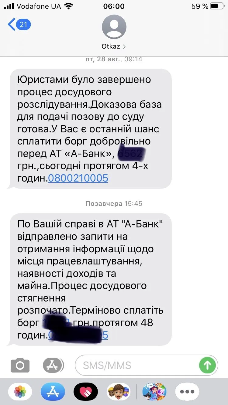 Шлют такие смс,страшновато!два дня назад сумма была одна,сегодня уже в два раза больше указана.Звонки поступают порядка 50 в день.я игнорю.чего можно ждать,суд?