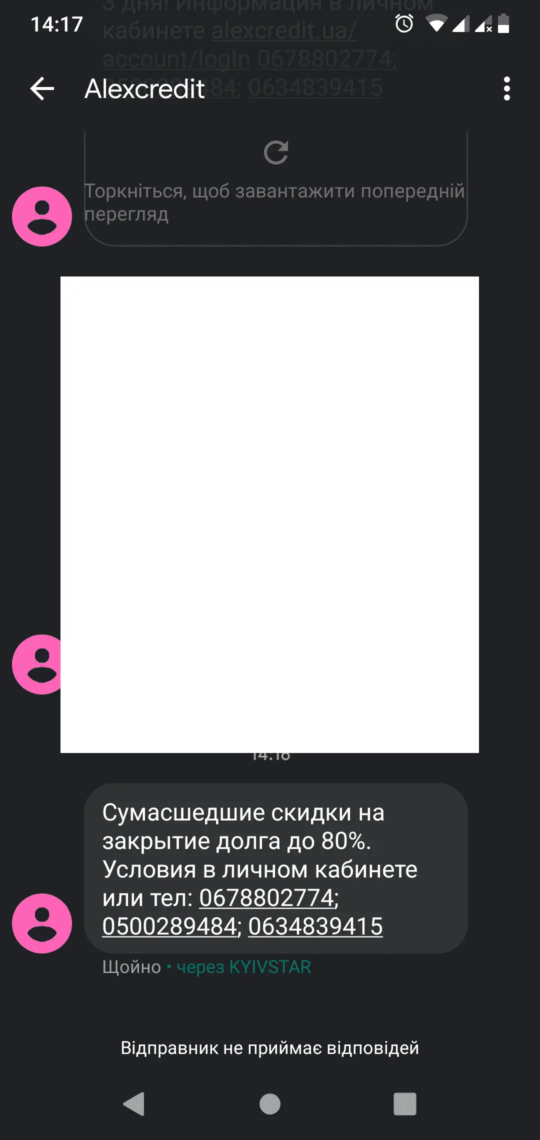 Сьогодні списали із заблокованої!!! Дебітової!!! Карти приватбанка три платежі по 5200грн. тепер там мінус 15600. Подзвонив на горячу лінію привата, сказали шо якщо сервісом не користувався, то оформляють заявку на шахрайство, а якщо користувався, то все законно. Зайшов у кабінет алекскредіт, там борг 5200, не платив більше двох місяців. Тепер ці ******* будуть так списувати гроші?