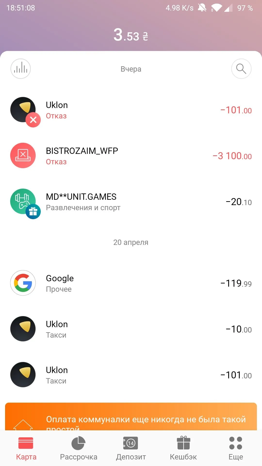 У меня тоже с засвеченной перед ними карты, каждый день по несколько раз пытаются снять разные суммы. Не знаю кто, у меня 11 шараг. Но я закрыла все счета в банке, приват. Пусть себе снимают 00000000. А перед этим таки удалось своровать у меня 5 тыщ с карты ощад. Е воши. Я все тогда заблокировала. Закрыла займ и..... Снова взяла у них же такую же сумму, так сказать компенсация ????. Ну и отдавать не собираюсь, я ранимая.
