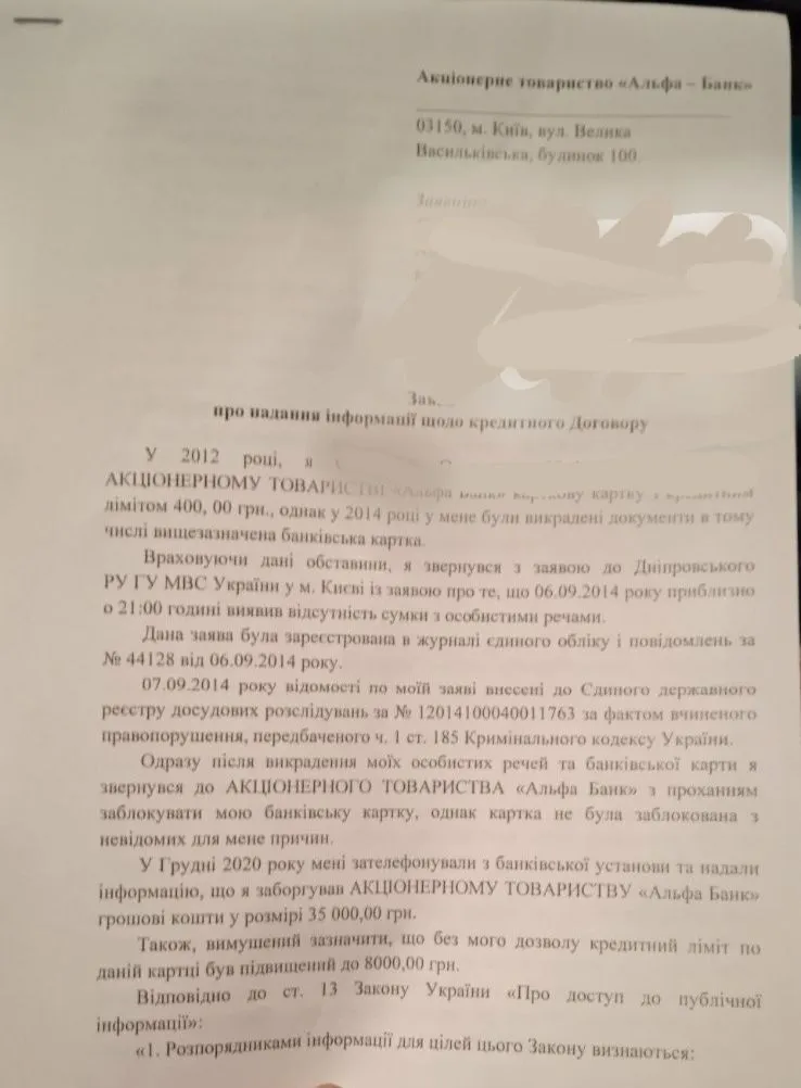 У мужа в с 2012года была кредитка альфа банка с лимитом 400грн(карточка нужна была просто для поступления денег)в 2014 году у него украли сумку со всеми документами и соответственно карточками.Все оформили через полицию как положено. В банк обращался чтоб заблокировать карточку,но ему отказали давать какую-либо информацию по карте.Ну и он на них забил.И вот 10.2020 они начинают ему звонить и сообщают, что у него долг 37000грн,он в ауте,откуда, а они сообщают что в 2018 был поднят лимит до 7000грн,у нас конечно же до фига вопросов типо а как же срок карточки?она не могла быть действительна столько лет,а как же перевыпуск и нет у человека на руках да и документы то,что в банке не действуют паспорт другой. Они все долбят вы пользовались эти года картой хоть тресни.