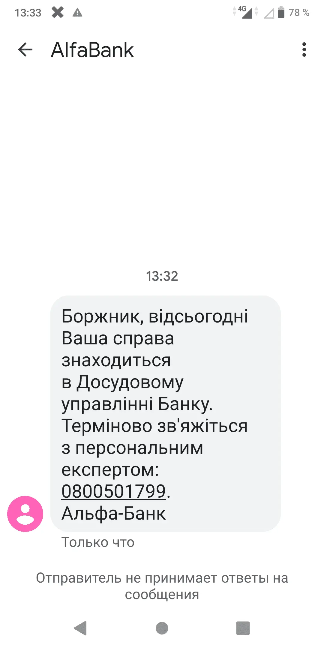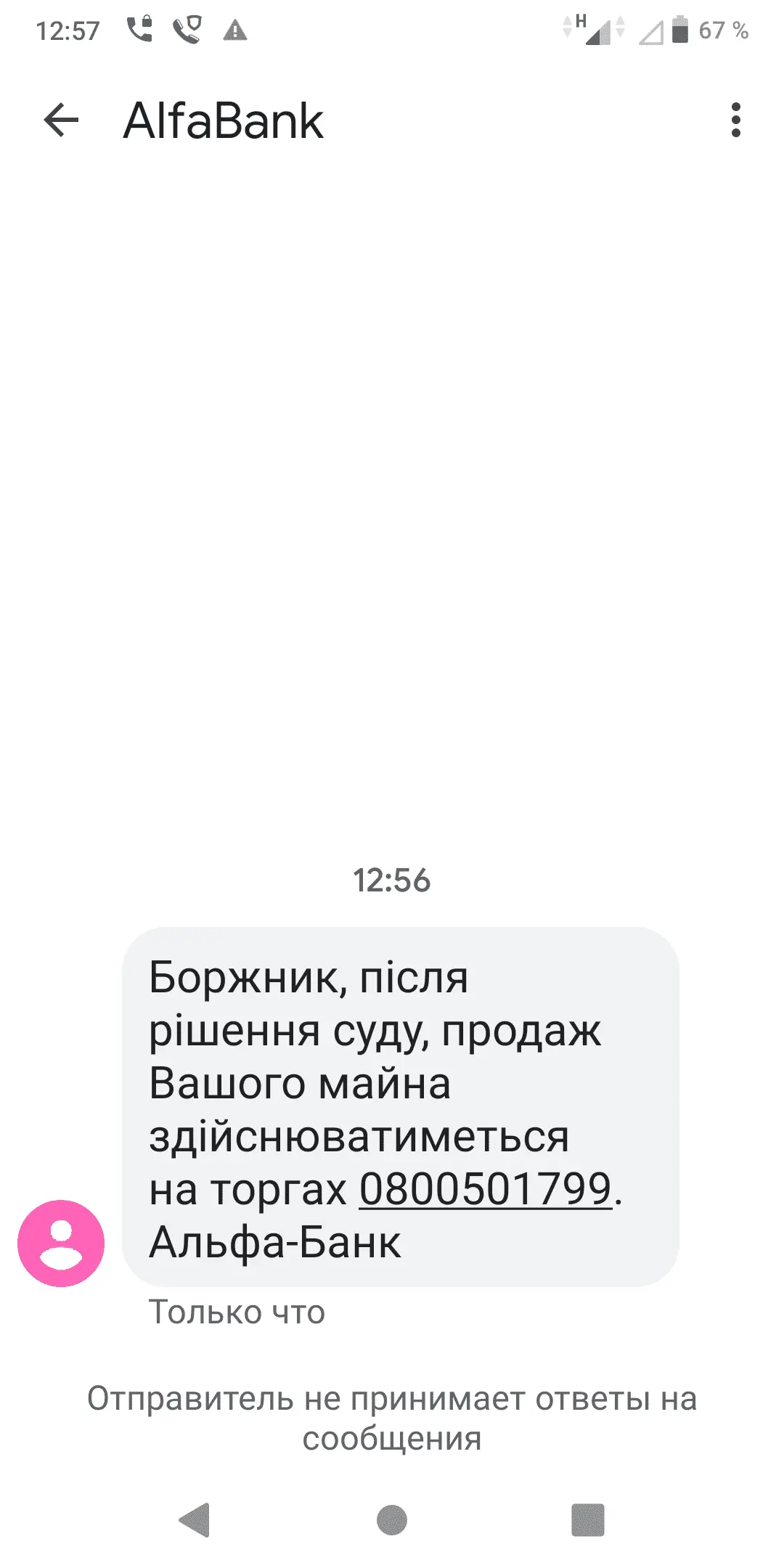 Шановний клієнте, кредитор зробив запит на БЛОКУВАННЯ всіх ваших рахунків в інших банках. 0800500286. Альфа-Банк