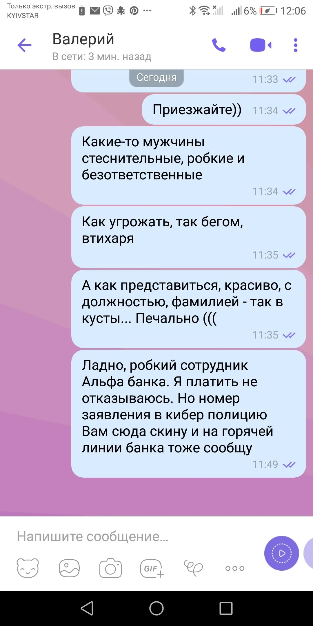 Меня Альфа начал долбить... По реструктаризации не плачу несколько месяцев. Сегодня угрозы в вайбер. Кто знает, с этим можно в кибер полицию?