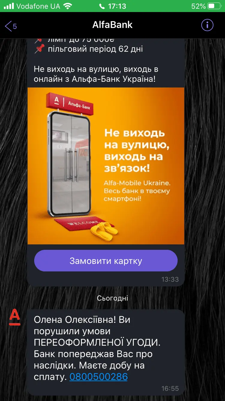 просто пугалкаКак и многие в украине осталась я с 16 марта в бесплатном отпуске, доход 0,00. На покушать уже нет, не то чтобы погашать что то( в альфа есть 2 карты и кредит, кредит смогла положить а карты вообще не за что, уже второй месяц. На телефоне стоит блокиратор на звонки, поэтому мне не звонили, возможно родным но из за мфо они посылают просто всех. Что эти товарищи имеют ввиду таким типа смс.... и что могут сделать?