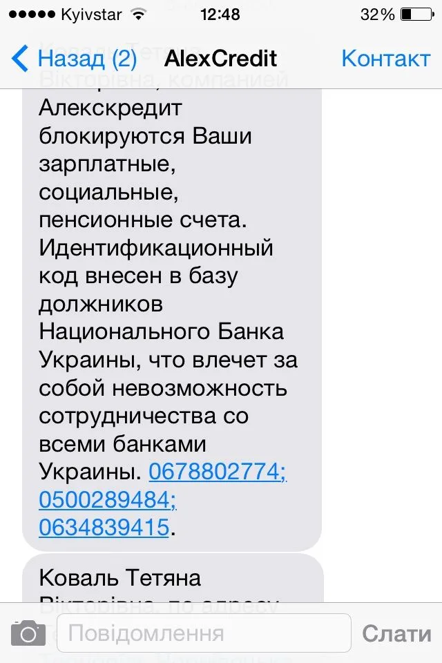 Алексы сегодня что-то активизировались. Мне такое смс пришло: "****, готовы заключить реструктуризацию по Вашему долгу. Срочно свяжитесь для согласования графика оплат. Это последний шанс решить вопрос добровольно. Иначе мы будем вынуждены беспокоить Ваших родственников. 0678802774; 0500289484; 0634839415."