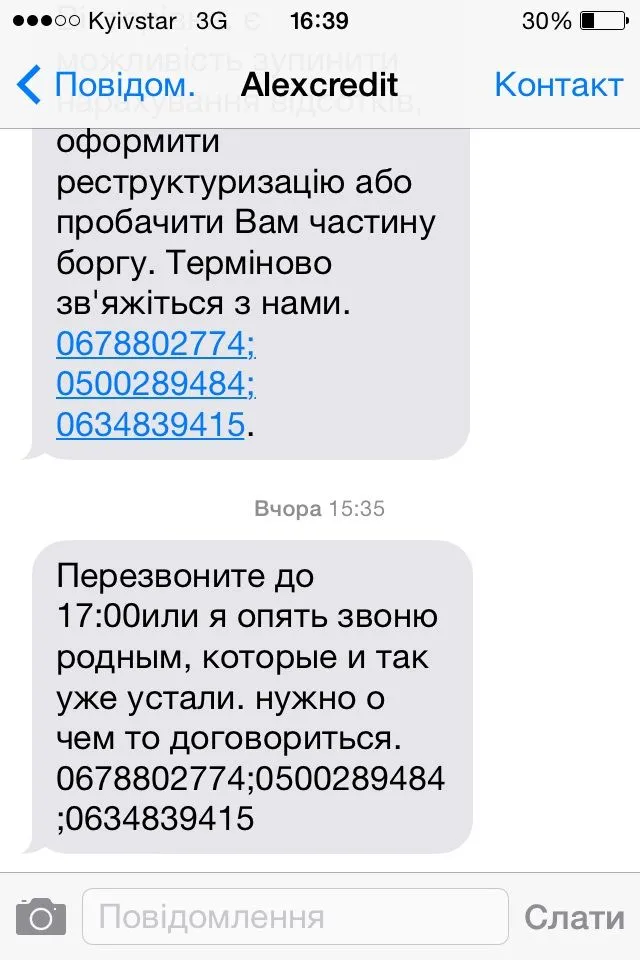 Я шось пропустила цю тему,ну Моіі взагалі не спілкуються з ними сказала шоб ігнорували всі невідомі здвінки, але моїй свекрусі регулярно шлюб смс сказала шо шахраііСегодня Админ выкладывал запись, как ведут переговоры они с родными. По моему после этого их можно только посылать в места не столь отдаленные и максимально стараться объяснить родителям о том, что с этими неадекватами общаться не о чем!!! Коллектор угрожает физической расправой родителям