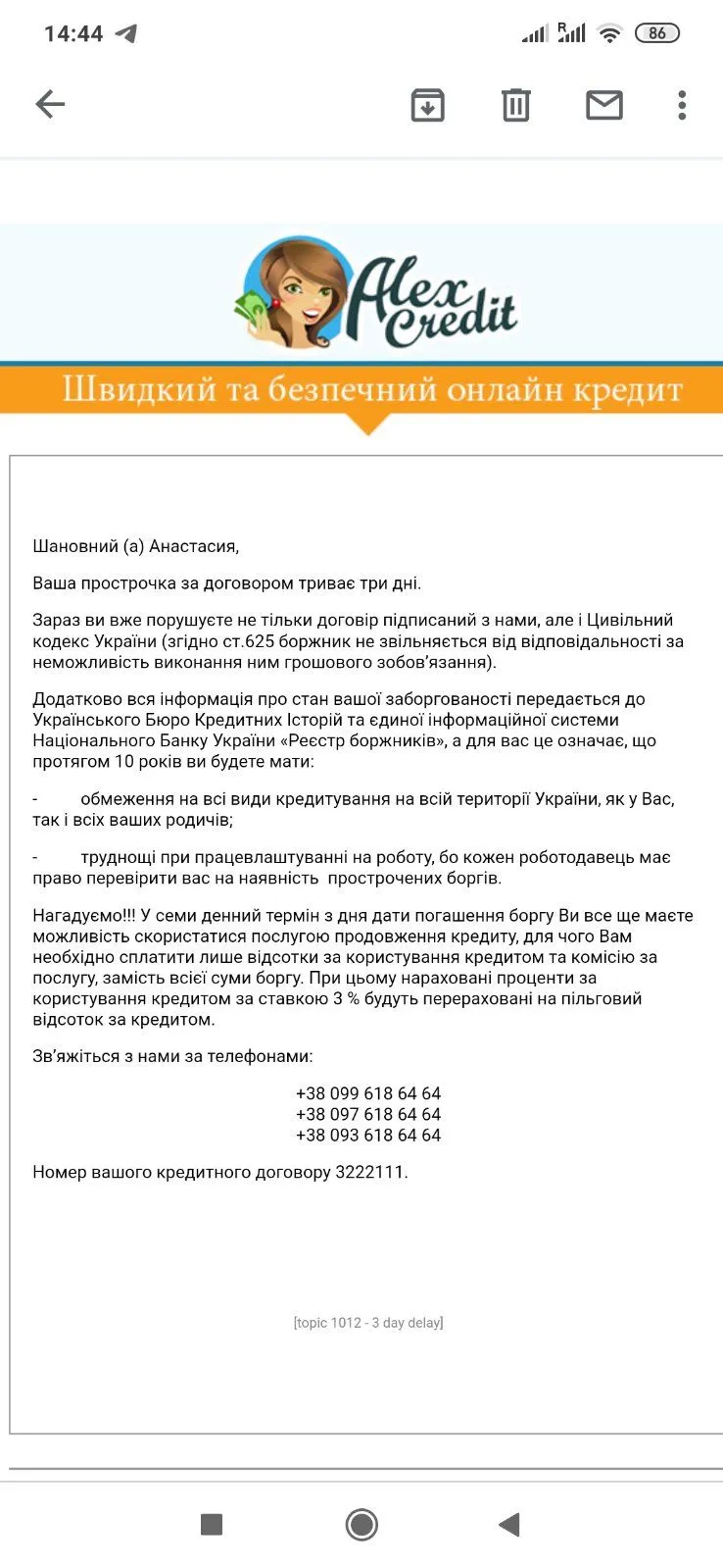 Всем здравствуйте. Пошла просрочка по Алекскредит. Тело 5000, трижды пролонгировала. Вышла на просрочку 3 дня и прислали вот такое письмо на почту. Понимаю, что пугают, но день уже на нервах. Через сколько они начинаю терроризировать родных и на работе? С ними как то можно договориться о частичном погашении?