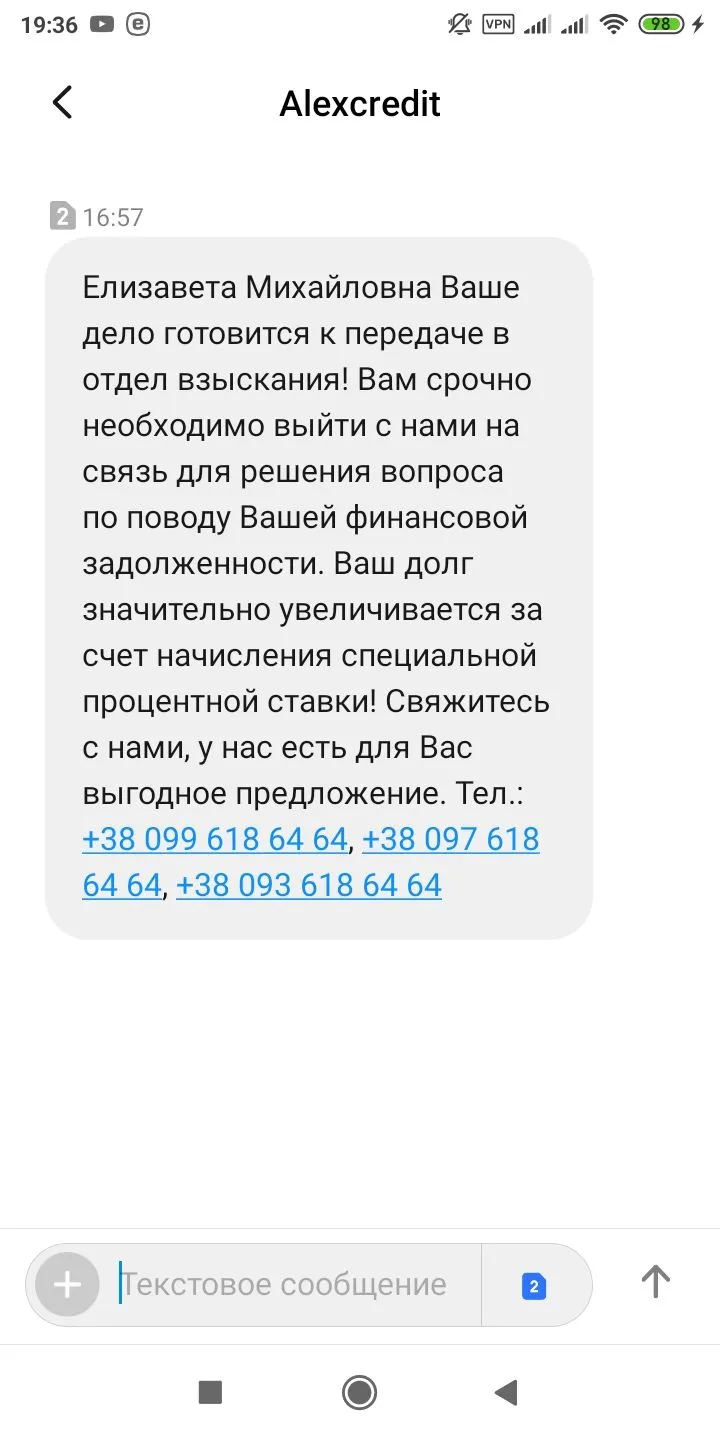 Добрый вечер! Пару дней назад с АлексКредиту были звонки к моим родственникам (мать, отец, родная сестра отца. Отец и сестра живут в другом городе.) И сказали им, что я взял кредит и они являются поручителями. В случае, если я не оплачу долг, то они будут оплачивать за меня, так как являются поручителями. Номера своих родных я не давал, они сами нашли. Мать я смог убедить ,что это мошенники и никакого кредита я не брал. Но отца я так и не смог предупредить, но если бы и успел ,то отец бы поверил(что является поручителем) больше им, чем мне