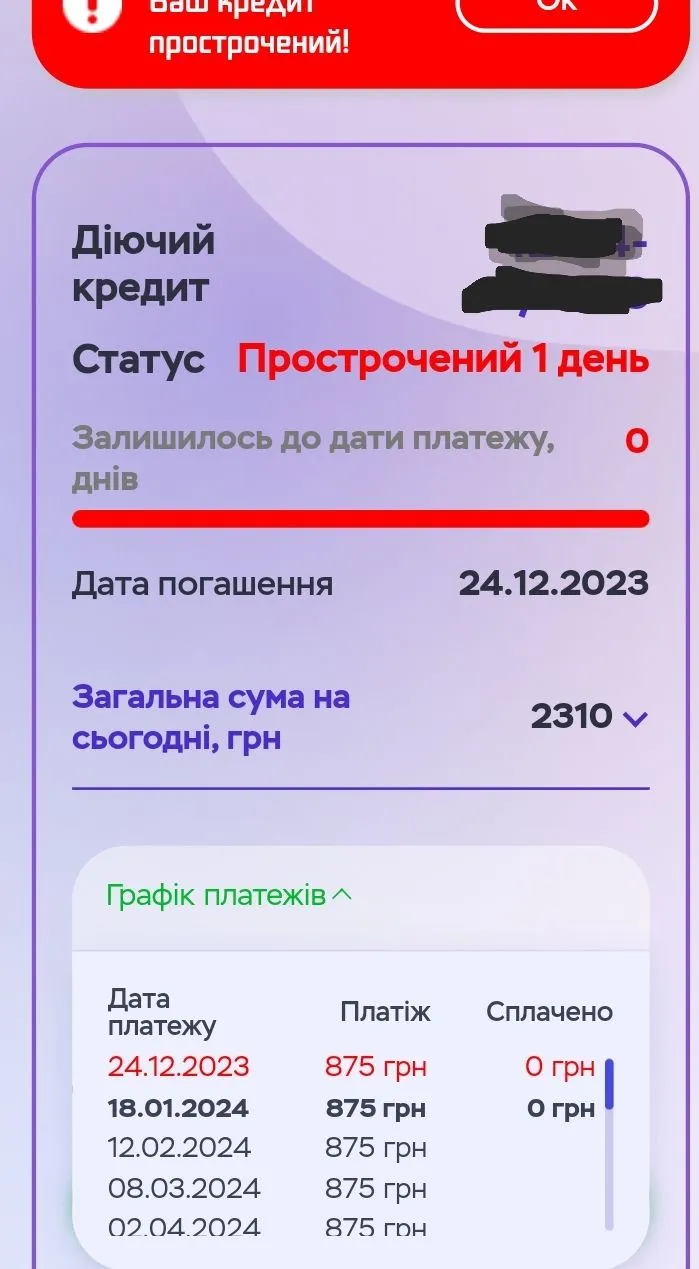 А в мене в Аванс прострочка на 1 день тіло 1400 до сплати 2310