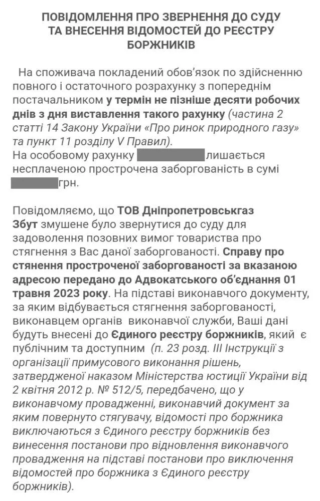Минулого тижня надійшов лист (дивіться у картинках). Вказано, що попередній постачальник газу "Дніпропетровськгаз Збут" (01.05.2022 його було змінено на Нафтогаз) готовий подати до суду. Про цю несплачену суму зовсім забув і взагалі думав, що ми її сплатили. Зайшовши на поштову скриньку, був дуже здивований.