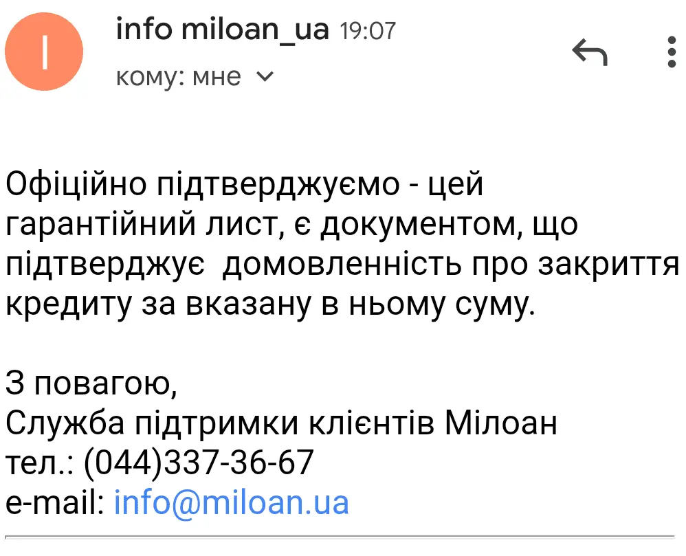 Добрый вечер Tarass,скажите пожалуйста,сегодня получила гарантийку от милоан но не с их електронки,а там домен...miloan.ua,но мне как-то не по себе,боюсь что обманут,написала на их електронной адрес и пришел такой ответ,может ли это в случае обмана быть каким-то доказательством этой гарантийки.заранее Спасибо!