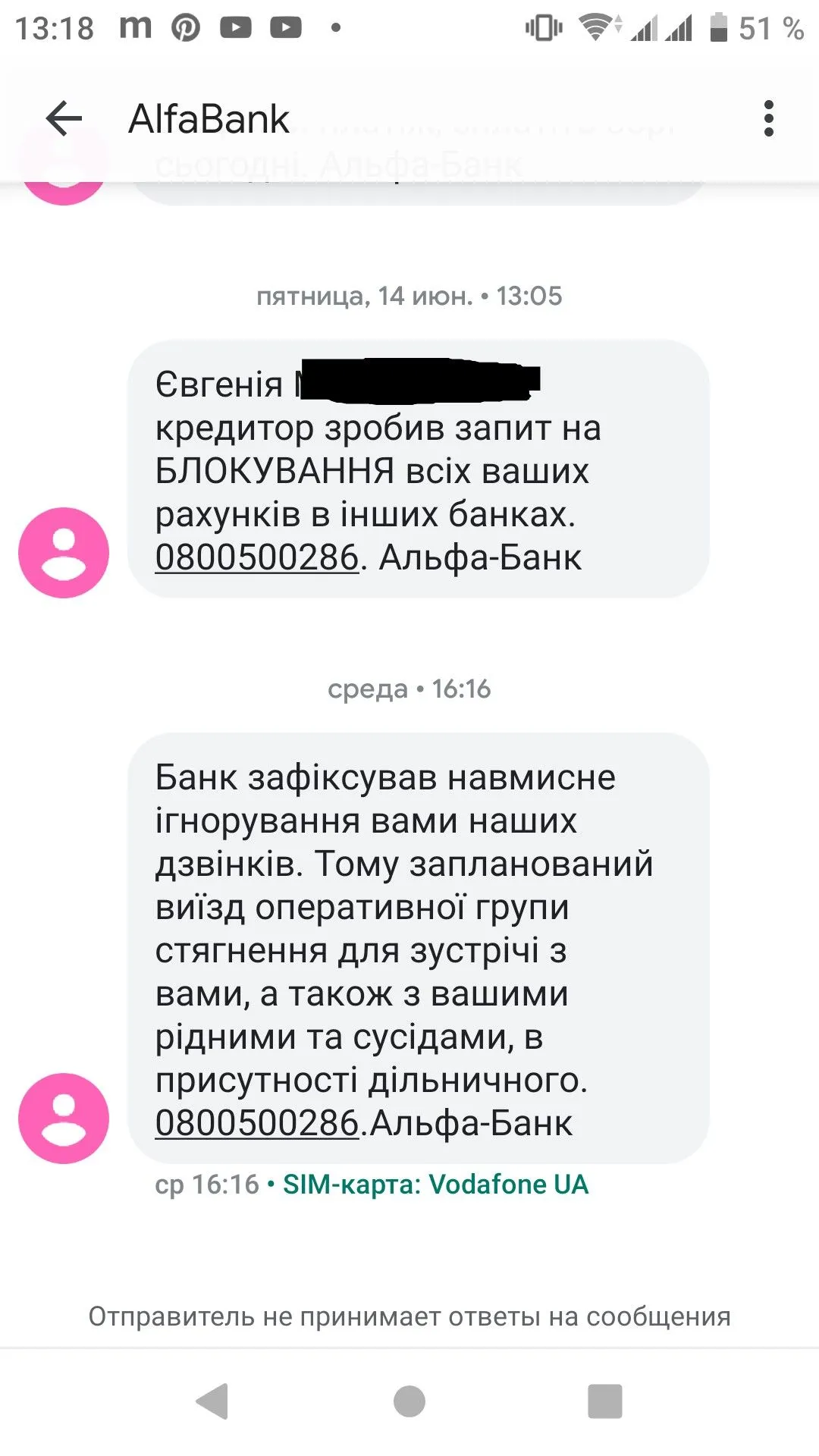 ФИО, кредитор зробив запит на БЛОКУВАННЯ всіх ваших рахунків в інших банках. 0800504049. Альфа-Банк
