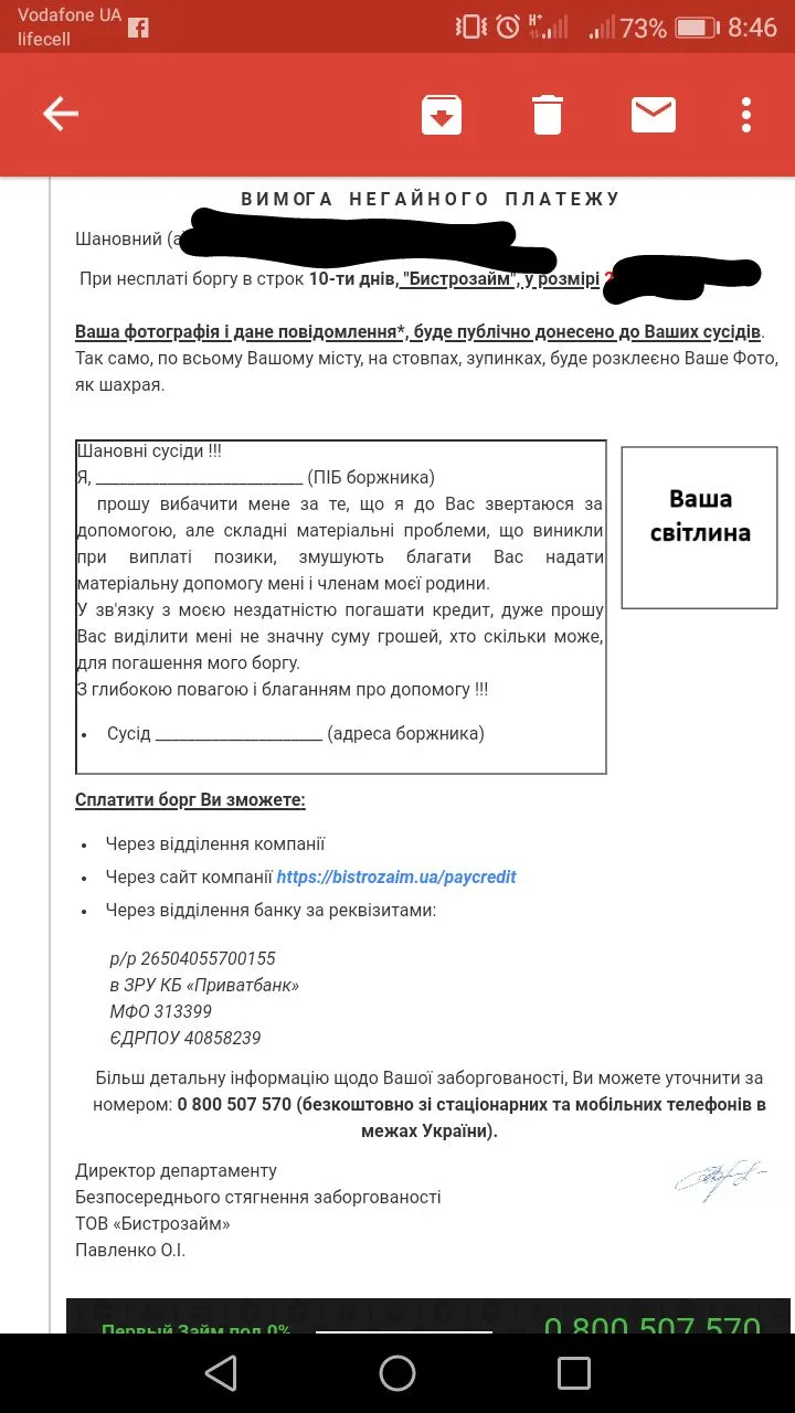 Быстрозайм не трогал меня 3 месяца, а вчера звонит мама и говорит мне звонили с какой то канторы,что ты должна 39 тыс,сегодня надо их отдать,а то тебя на работе найдут,придут заберут,и завезут в Киев для дачи показаний. А потом через час ей позвонил мент,якобы ещё и с этого отделение где моя работа,и сказал маме,что на меня написали заявление и он будет открывать криминальное дело,по статье Мошенничество.