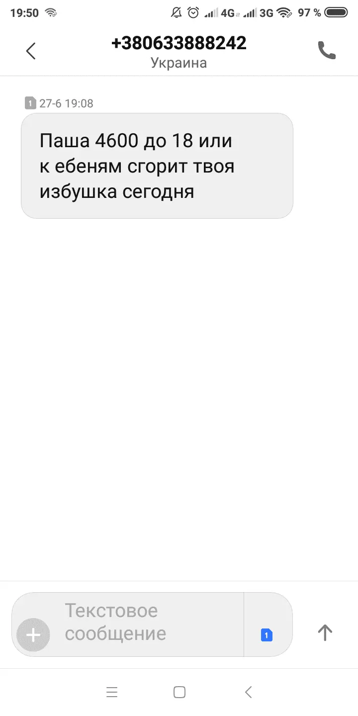А мне вчера звонила сумасшедшая, кричала, оскорбляла и отключилась. Потом прислала СМС "ГНИДА ГОТОВЬСЯ РАСПЛАТИТЬСЯ" После позвонил какой-то клоун и с акцентом сказал что он уже подъезжает,что бы я мыла жoпy?. Сегодня пришло смс Podgotov'te imushestvo po adresu registracii dlya ocenki i dal'nejshego iz'yatiya. Zaplanirovan vyezd sotrudnikov sluzhby bezopasnosti. Bystrozajm
