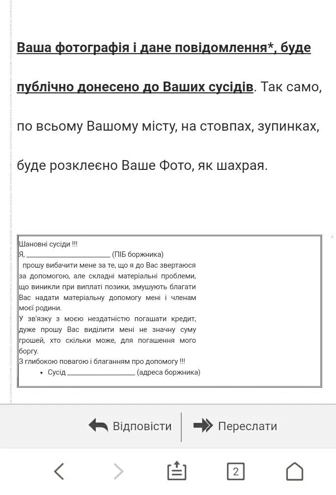 Мне тоже такое прислали сегодня.Так я на них написал жалобу "Урядовый контактный центр" и эту рассылку прикрепил скрином как угрозу.(ну и дополнил о том что звонят родственникам и знакомым с требованием оплатить мой долг.пусть ещё и за вымогательство им мозги вставят)мне вот смс прислали... что жадать дальше незнаю