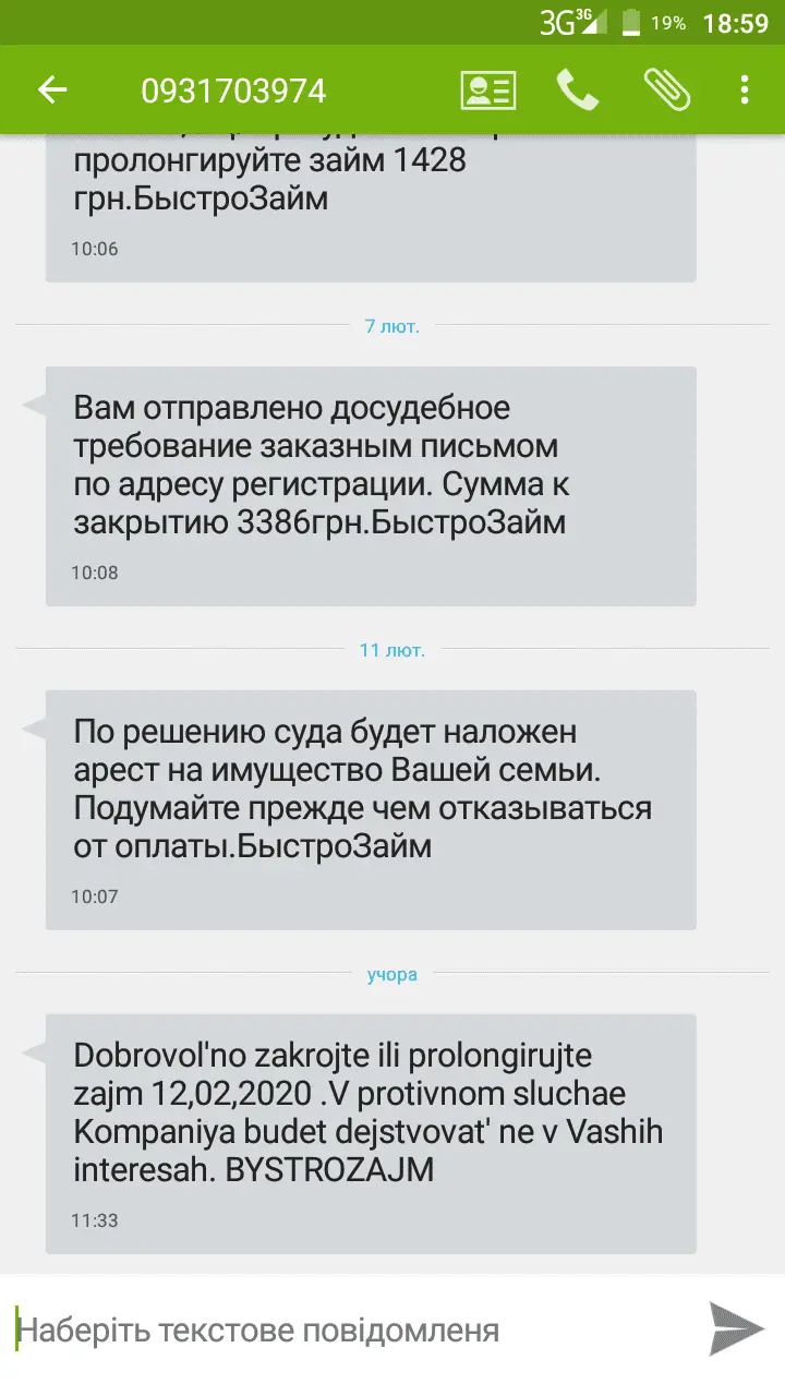 Хто знає які методи роботи використовує БИСТРОЗАЙМ. Тіло кредиту 2500 з яких 2000 тис. оплатила, але відсотків набігло уже на 10000,просрочка трохи більше двох місяці. Спочатку дзвонили часто, як провела оплату в листопаді, став дзвонити робот. Голові селищної ради дзвонили, представлялися співробітниками поліції і до мене теж той самий співробітник дзвонив. А 26 грудня він же капітан поліції обматюкав мене так що використав мабуть увесь запах ненормативної лексики. Склалось враження що метою дзвінка було не вибивання грошей а матюкання. СМС вже не надходять давно, лист прийшов типу з заявою по шахрайство, з колючим дротом і все таке. СКАЖІТЬ, на що ще вистачить їхньої фантазії, ЧОГО ЩЕ ЧЕКАТИ.