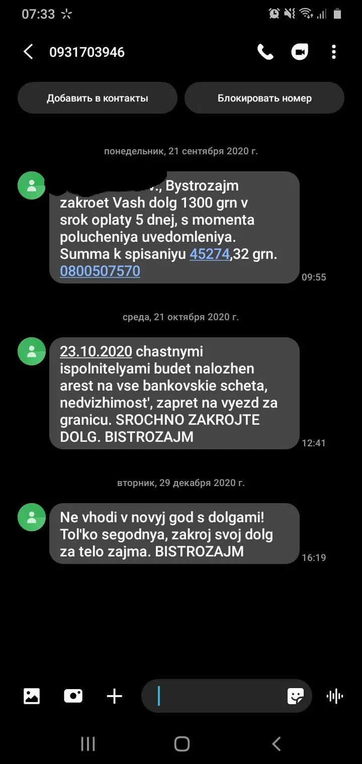 Бистрозайм брала 5200 постійно пролонгувала по 1800, зараз прострочка з листопада , наросло відсотків 18000, я оплатила їм 7000 тис хочуть ще 4000 і закриють борг. Сьогодні і вчора видзвонює до мене до чоловіка , якийсь тіп , погрожує щоб вже і негайно оплатила.