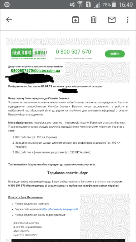 Привіт. Та у них багато варіантів де інформацію брати. Пишіть в поліцію заяву, там якось за присвоєння владних повноважень, ну і що вам дзвонять погрожують, номери роботів які дзвонять (думаю, все-таки хтось якось дзвонить).Всім привіт бистрозайм вже добрався до моїх сусідів тіпа слідчий звонив і казав що шукає мене де вони беруть інформацію про всіх,до мене вони не звонять