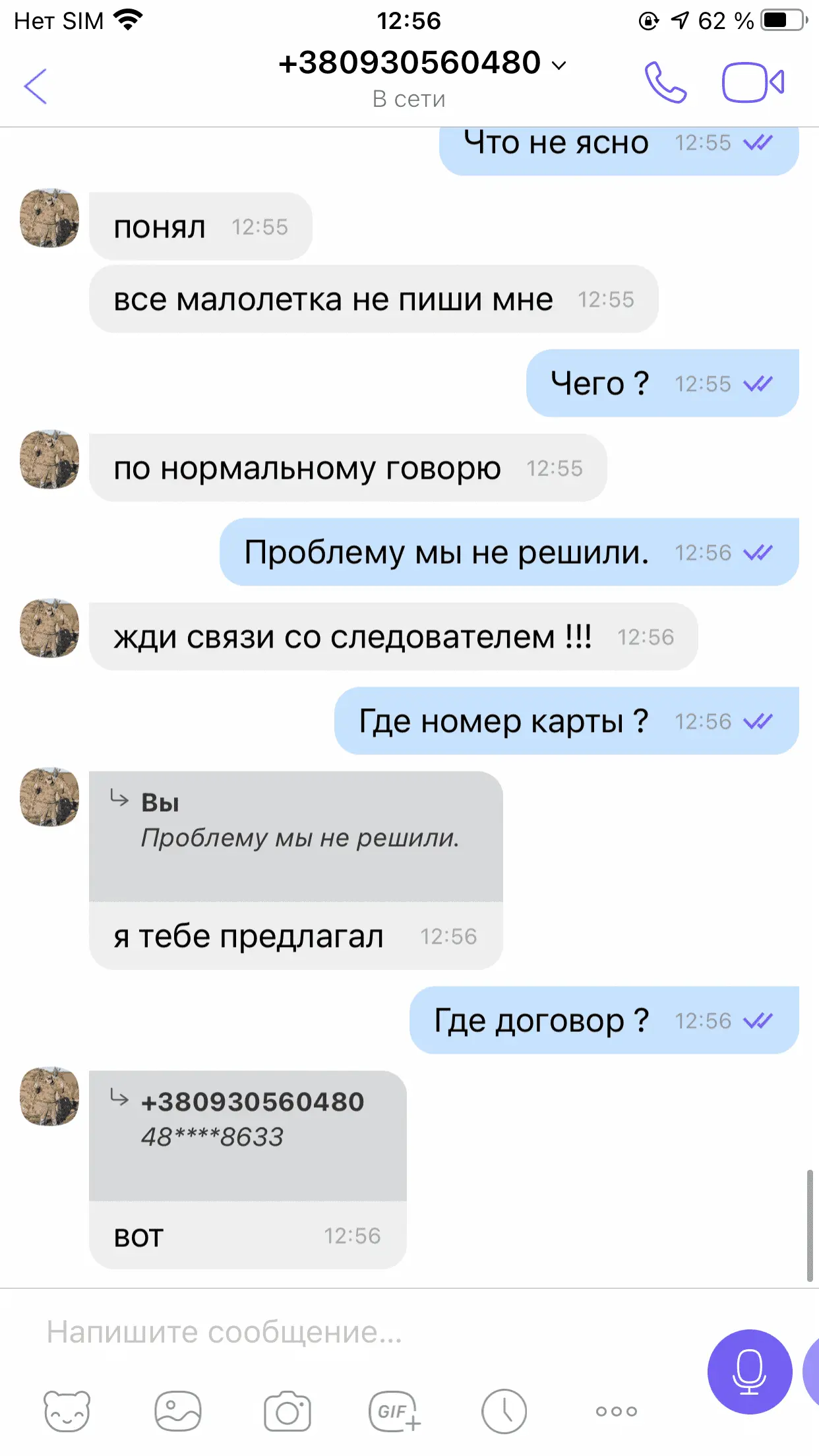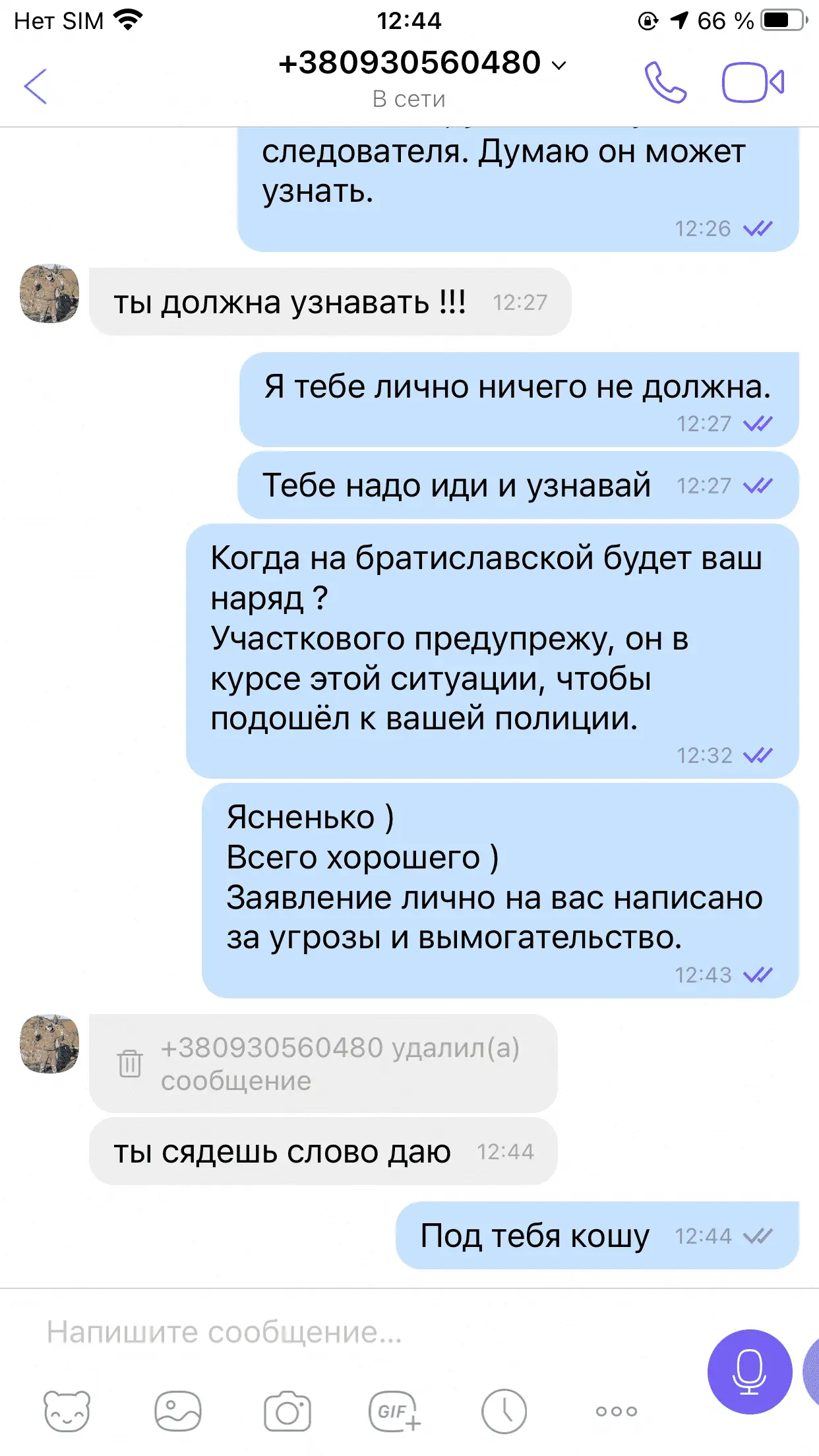 Он мне начинает в Вайбере угрожать какими-то следователями, судом и прочей херней, на что я этому недоразвитому объяснила, что мама в данный момент пишет на него заявление за вымогательство , угрозы и тд ( так как я на 40 недели беременности и выйти никуда не могу) пусть звонит ей и онлайн общается с полицией. Он позвонил, что-то налапшал им, полиция посмеялись с него. Далее он мне начинает опять писать угрозы, мол я и моя МАМАША НАТАХА( как выражался недоразвитый человек от быстрозайма) и эта женщина с полиции оказывается опг, и он нас всех засадит. По итогу этой всей бредни я ему начала накидывать обычные юридические аспекты, мол где номер карты, на которую выдан займ, где договор, и тд. Так же указала на низкий уровень развития данного недомужика. И попыталась уточнить почему за полтора года моих просьб подать на меня в суд вы ниxepа не сделали?