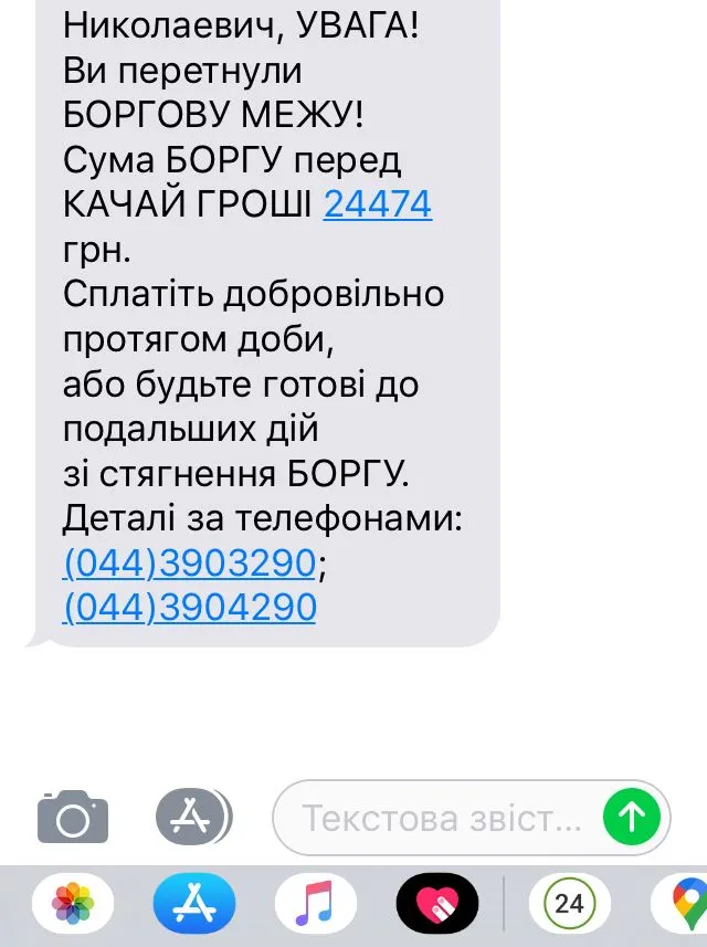 Мне 16.03 прислали смс, что якобы "перетнула боргову межу", а 8 апреля по адресу прописки пришло письмо на моё имя. С угрозами, всё как они любят. Дали якобы 5 дней, на погашение. Тело 2300, хотят 7800.