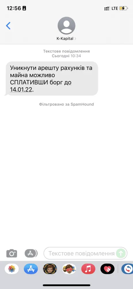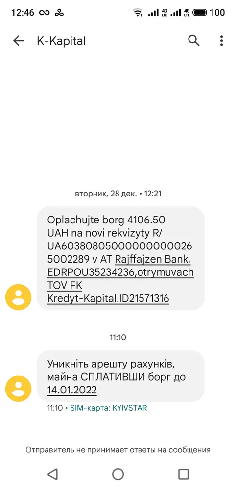 Я Вам советую просто проверять себя в реестрах, надписи они делают аж бегом.Ребята, привет! Качай Гроши 28.12.2021 переуступили мой договор по кредиту в Кредит Капитал. Что от этих можно ожидать, может кто знает? Реально ли такое из-за 4106,50 грн? Сегодня пришло смс о том, что крайний срок выплаты долга до 14.01.2022, иначе блокировка счетов и арест недвижимости. По звонкам, честно, не знаю, звонят они или нет, от на незнакомые номера не отвечаю, в вайбер от них сообщений пока не было.