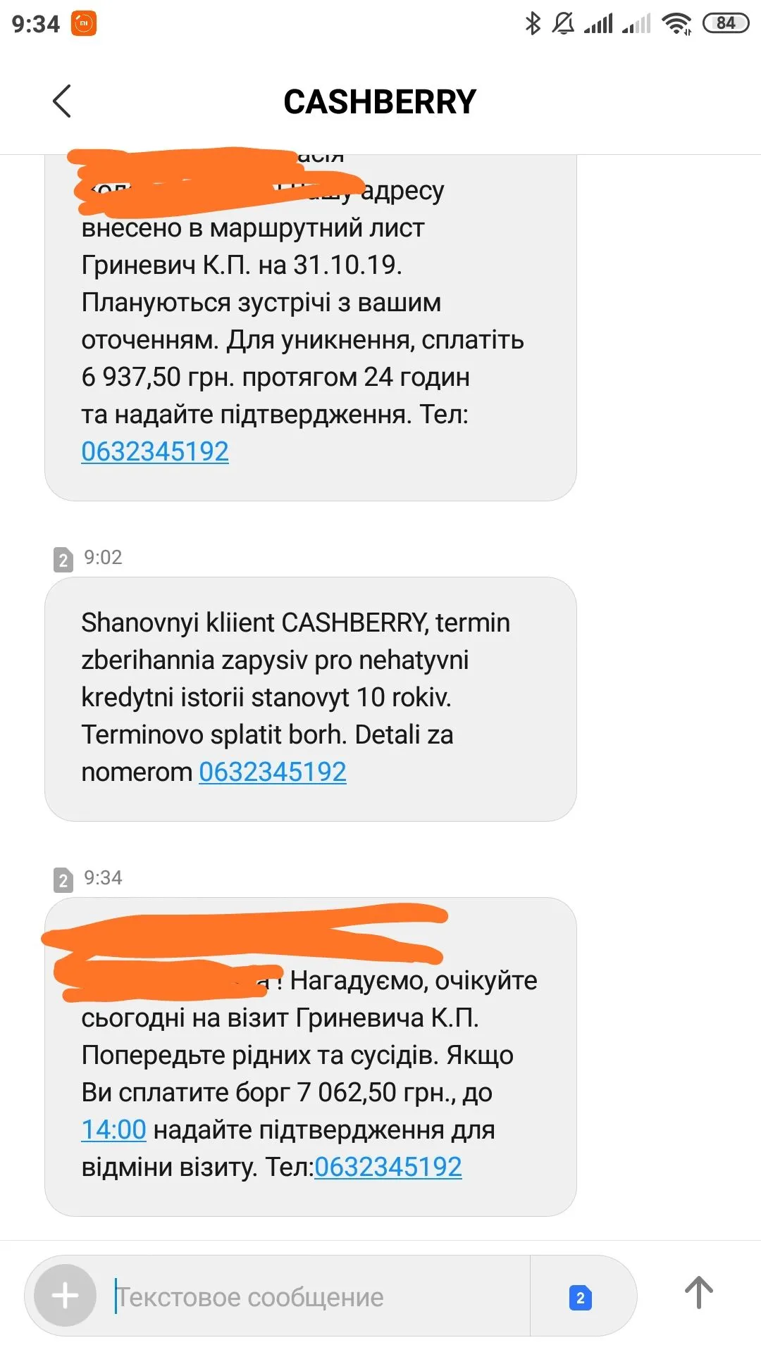 Нагадуємо, очікуйте сьогодні на візит Гриневича К.П. Попередьте рідних та сусідів. Якщо Ви сплатите борг 5 946,22 грн., до 14:00 надайте підтвердження для відміни візиту. Тел:0632345192Мне такое сегодня пристали