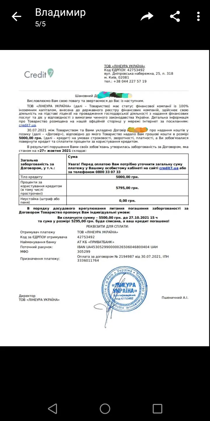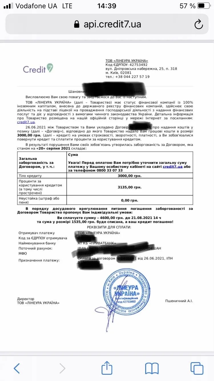 На виконання п.4.2.4 Договору про надання коштів на умовах споживчого кредиту №7, що укладений 30.07.2021 між........ та ТОВ «ЛІНЕУРА УКРАЇНА» ( місцезнаходження: 02081, м. Київ, вул. Дніпровська Набережна, 25, п.318), інформуємо: