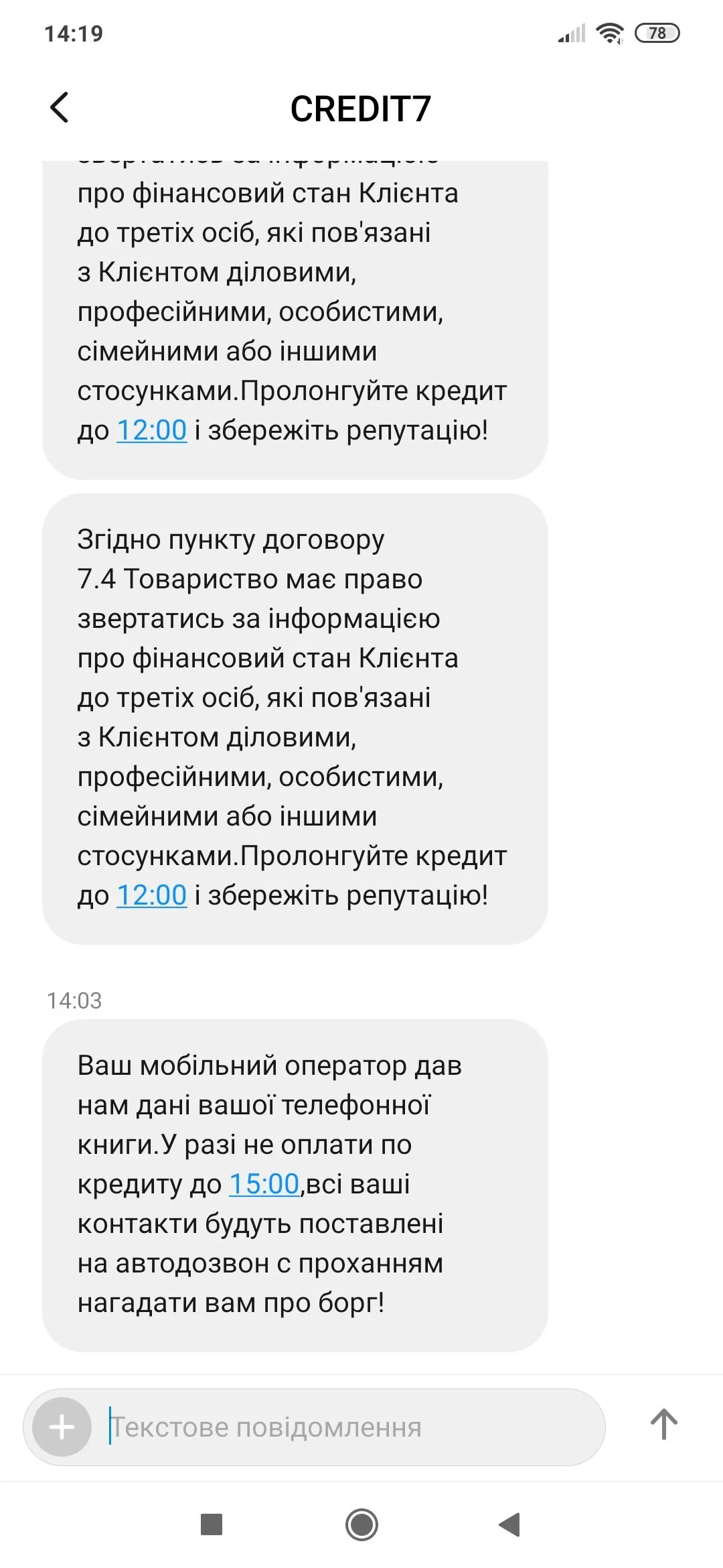 Сегодня мое утро началось с смс от Кредит7, оказывается самые дотошные, в покое не оставляют. Ты им говори одно, а они тебе другое. Всякий раз пытаются придумать что-то новое. Вот например вчера целый день ждала выездную группу, так никто и не приехал. Даже пирогов напекла, сегодня опять смс с угрозой, а по факту чего меры не принимают? В Нацком я написала жду ответа от них, ну ничем их не запугаешь, бесстрашные они какие-то. Вот прилагаю СМС у кого такие присылали?
