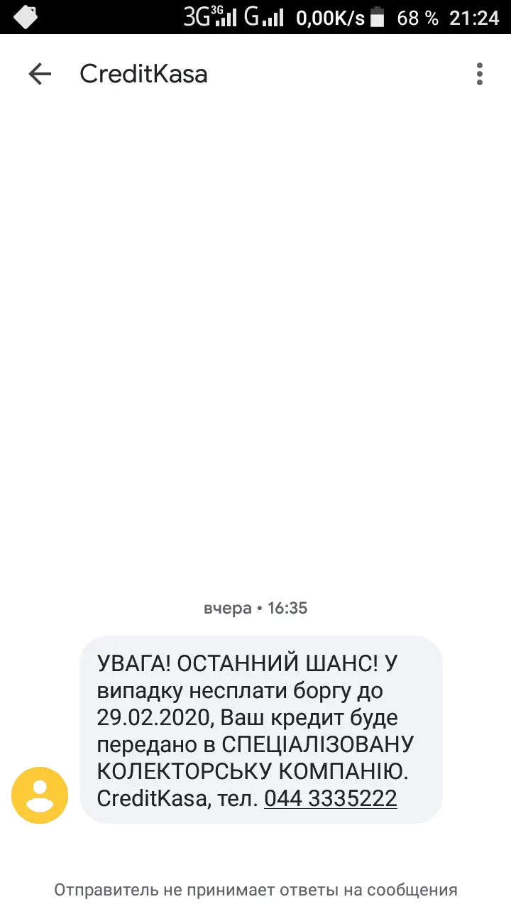 Мне вчера смс прислали, у меня там зависло 360 грн., так целый год молчали... ни смс , ни звонков не было , а вчера прислали " писульку"... Главное на конец апреля мой долг так и составлял 360 грн, за год он не поменялся ... Не начисляли ни процентов ни штрафов... А вчерас порадовали !!!