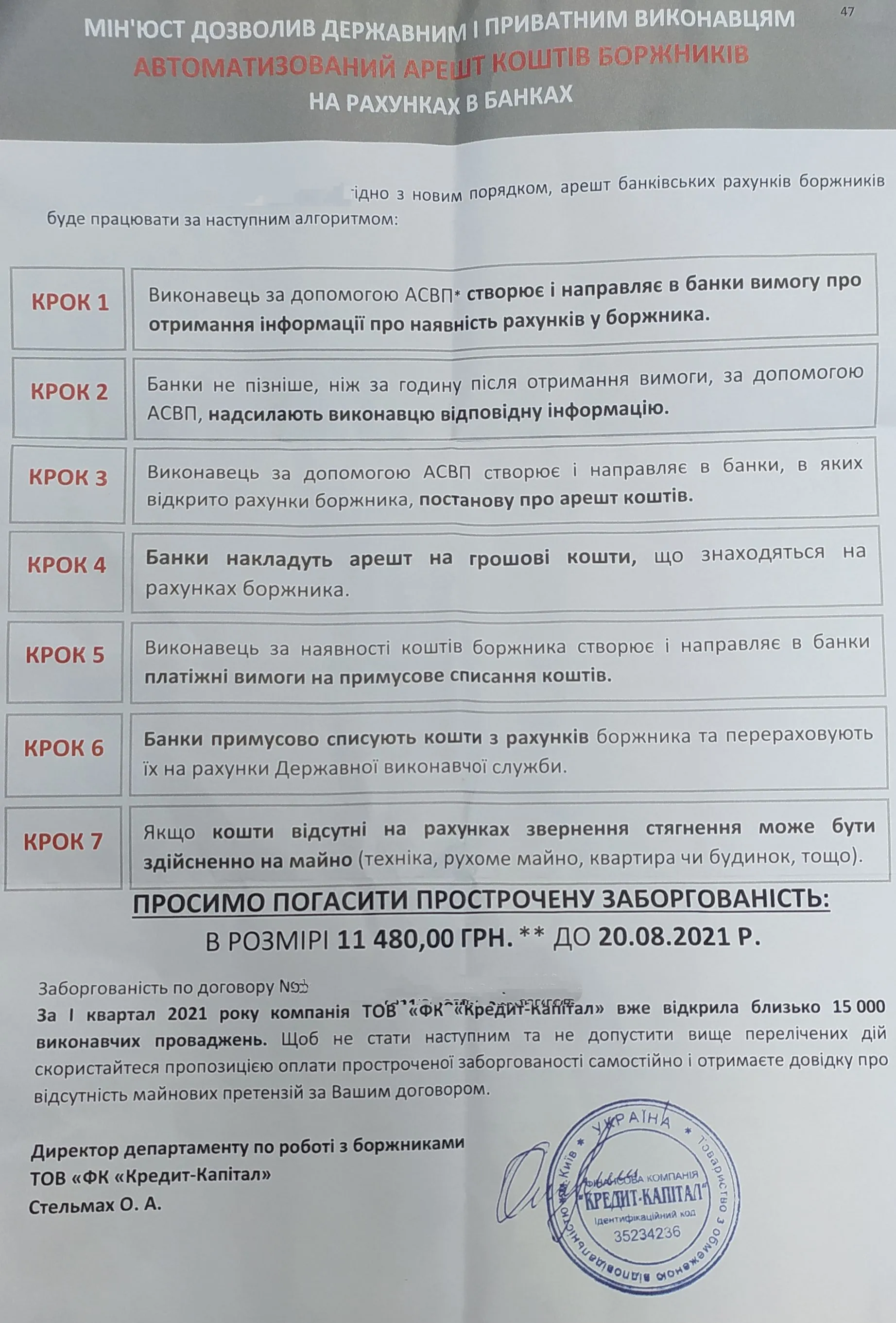 Мне они ничего не говорили. Я не беру трубкуКачай гроші на 22 день прострочки передали якомусь відділу , і запропонували списання , звонив тільки бот , я ще створював тему чи платити , закрив.