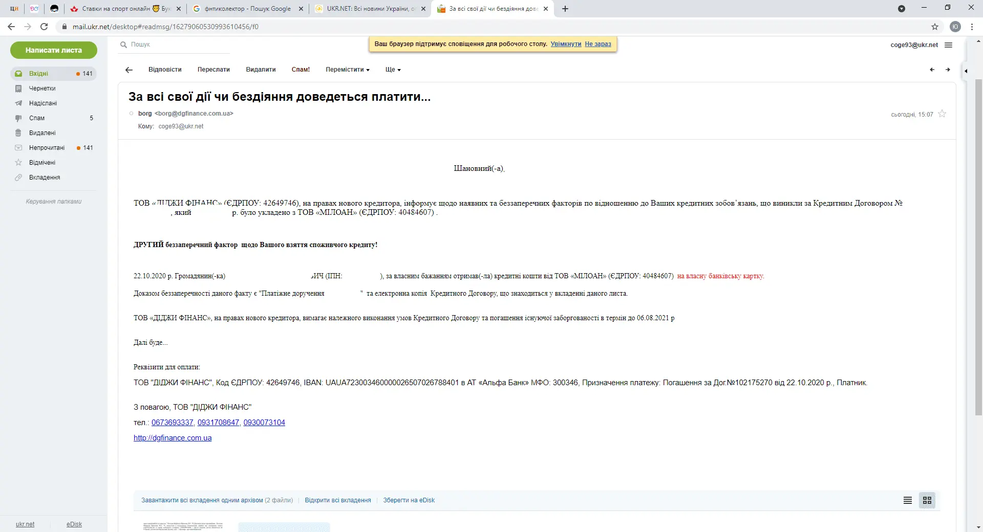Прийшло таке повідомлення на електронну адресу.