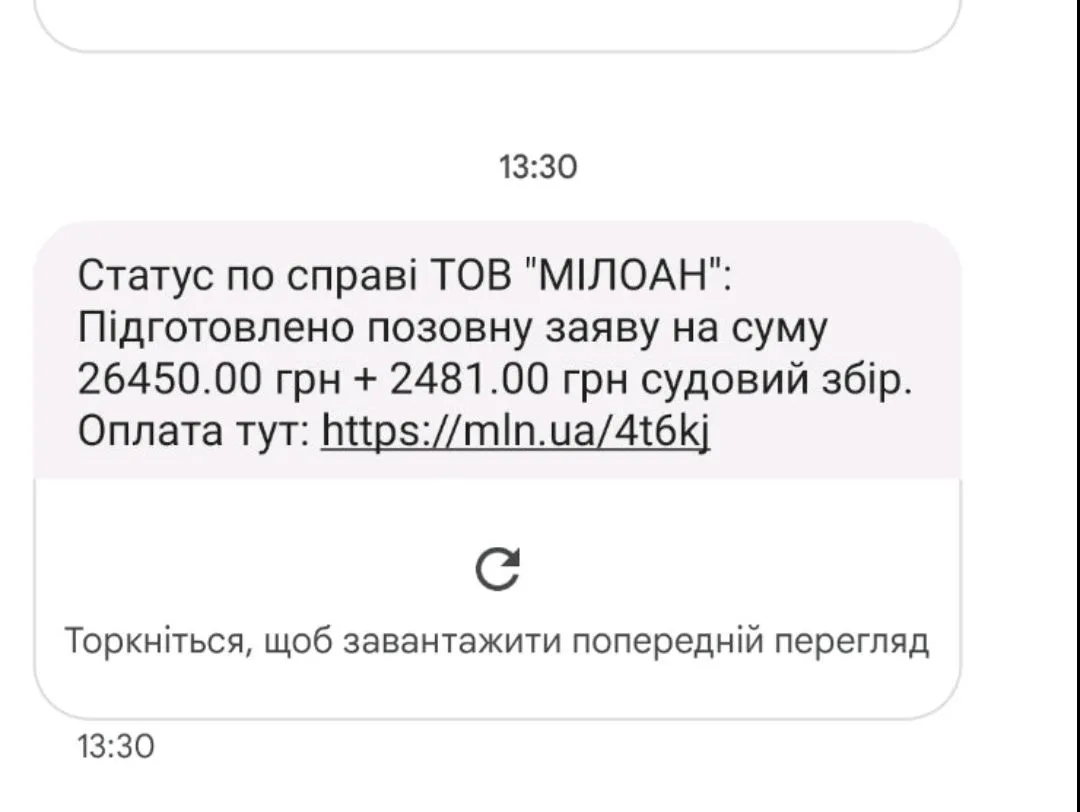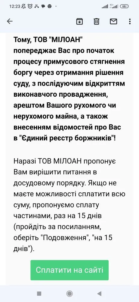 Хіба шо отакі в них судиШановні форумчани,доброго дня. Сьогодні отримала від Мілоан ось таке сповіщення. Підкажіть прошу усіх хто мав з ними справу як вони себе поводять ,чи дійсно звертаються до суду і через який термін. Тіл по МФО мені не пропонують, та й грошей зараз немає всеодно. Підкажіть як вони діють.
