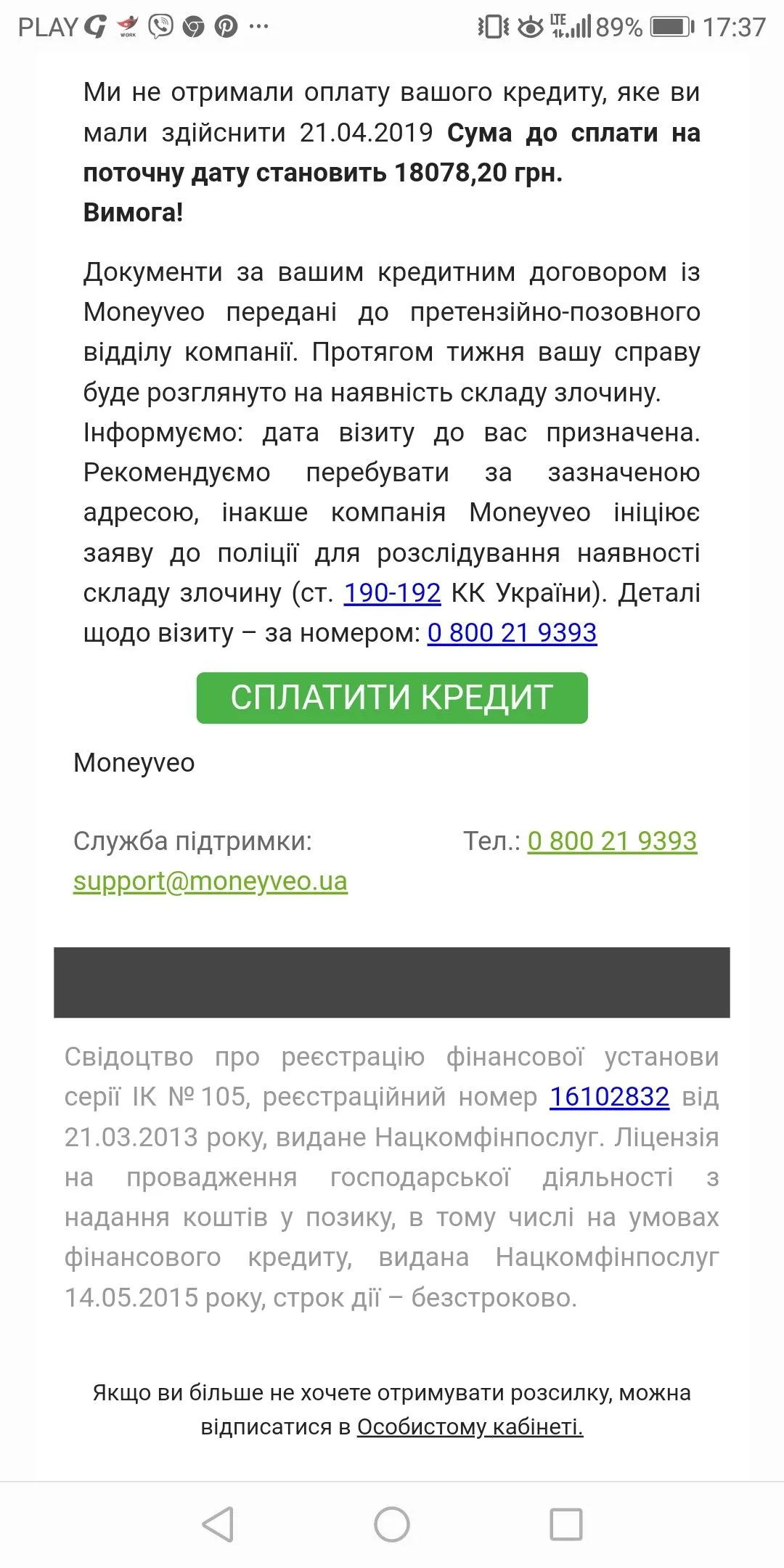 Любое сообщение, ЛЮБОЕ кроме официальной повестки в суд пугалка. Пора бы создать фак и запретить плодить глупые темыВсем. Всем. Всем. Кто создает теми для проверки бреда калов. Внимание: - если под текстом стоит кнопка оплатить или телефон без указания конкретного лица с кем связатся - это только пугалка. Отвечаю 100%.
