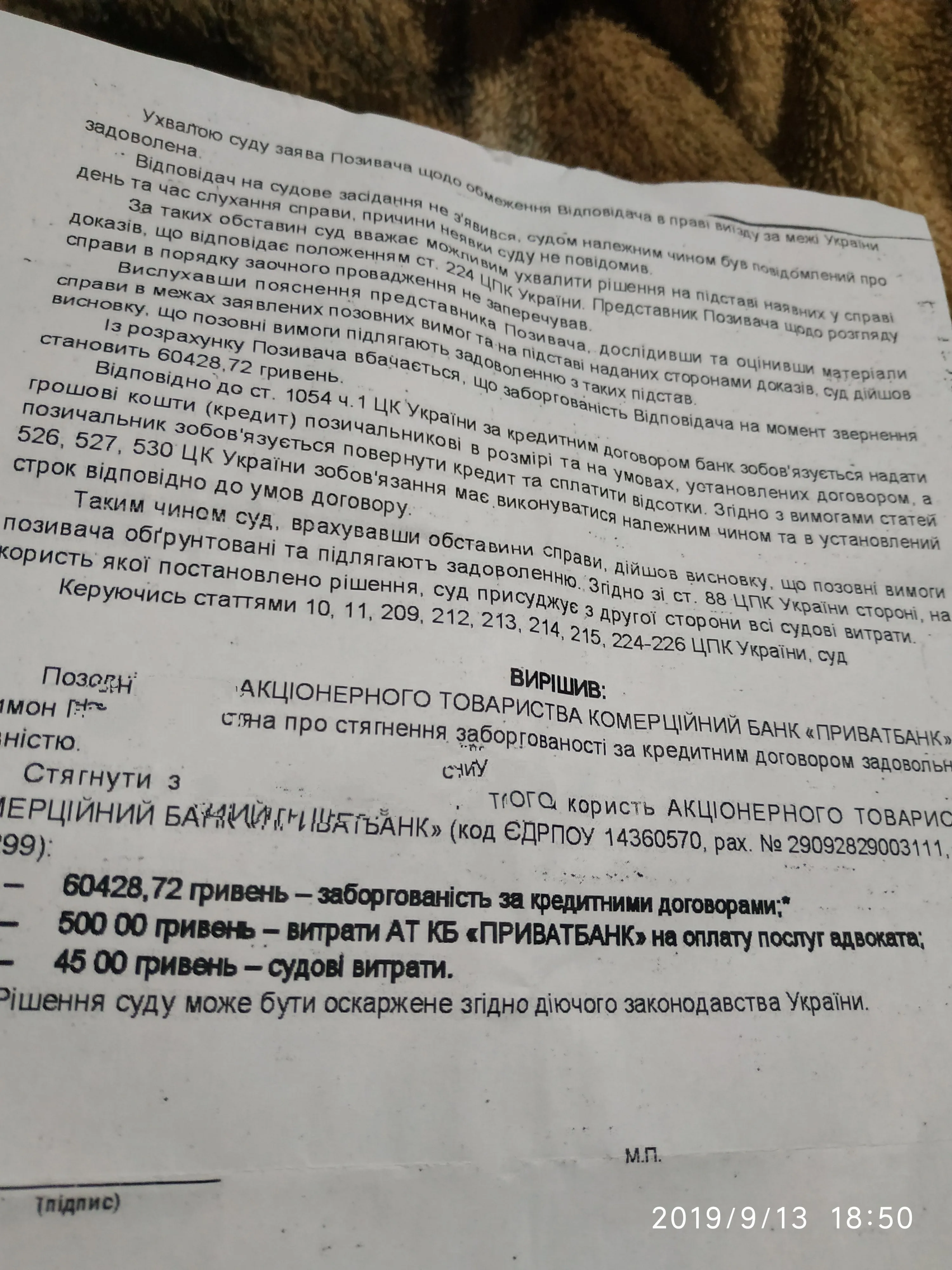 Ребята, сегодня получил таки повестку от Привата. Суд на 2-ое октября. Посмотрим, что можно сделать и на что способны они) оказывается ,что подавали еще 3 марта, но так как меня не могли найти, то суд переносился уже 2 раза. Нашел себя на судовой владе, сам поехал забрал повестку.