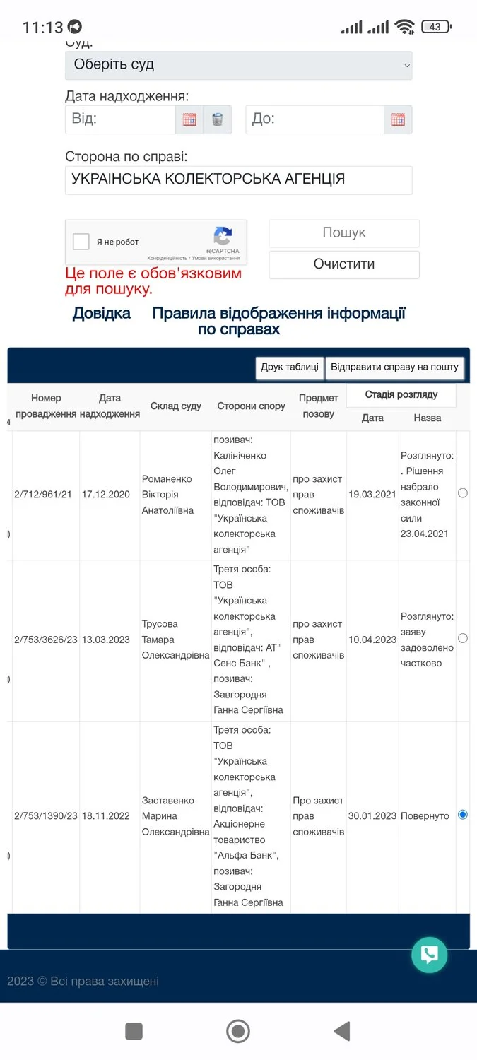 На портале Судова влада нет дел с их участием кроме трёх, которые подавали на защиту прав потребителей заёмщики