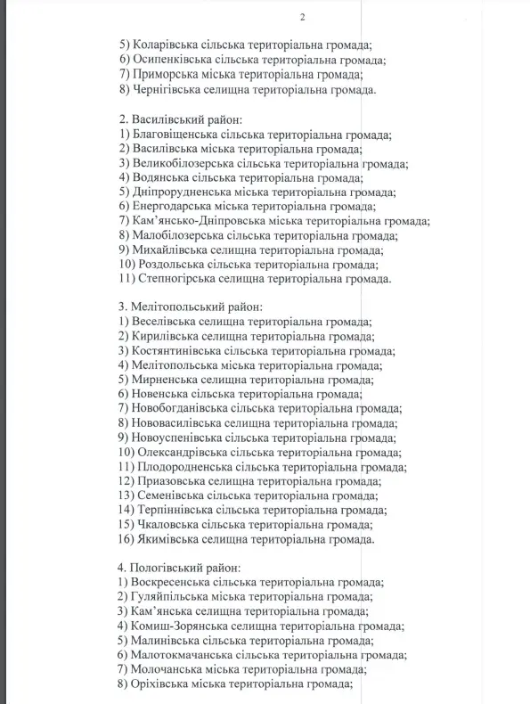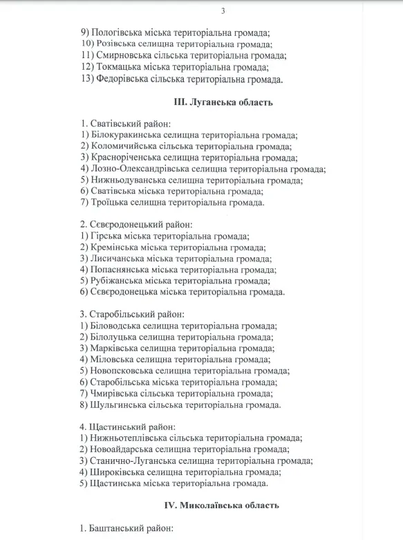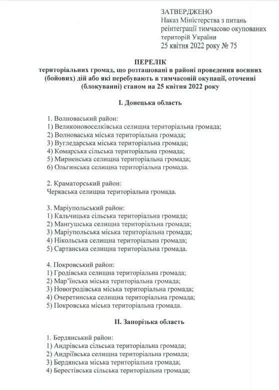 Міністерство з питань реінтеграції тимчасово окупованих територій України затвердило Перелік територіальних громад, що розташовані в районах проведення воєнних (бойових) дій або які перебувають в тимчасовій окупації, оточенні (блокуванні) станом на 25 квітня 2022 року (наказ від 25 квітня 2022 року № 75)