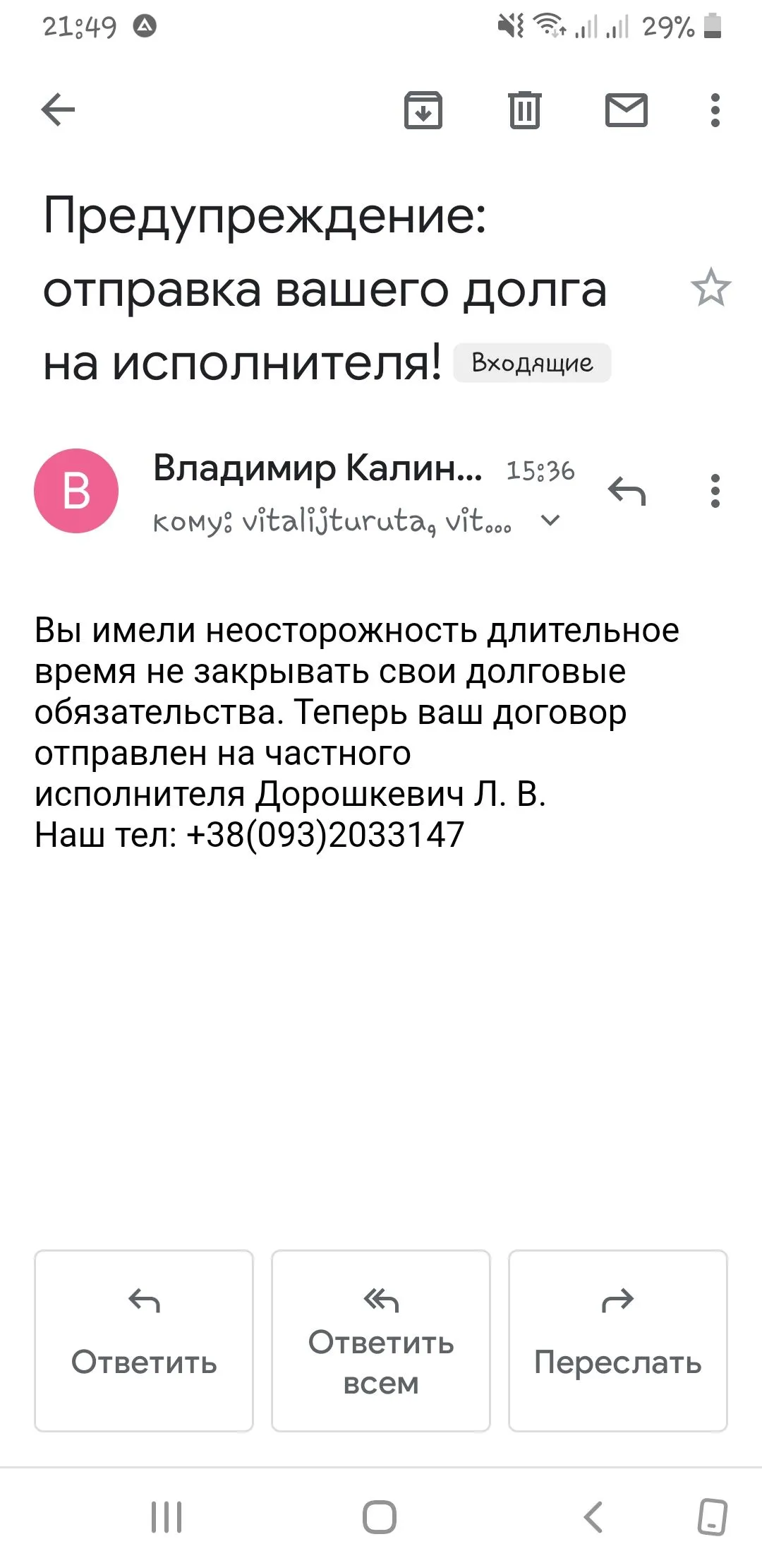Вы имели неосторожность длительное время не закрывать свои долговые обязательства. Теперь ваш договор отправлен на частного исполнителя Дорошкевич Л. В.