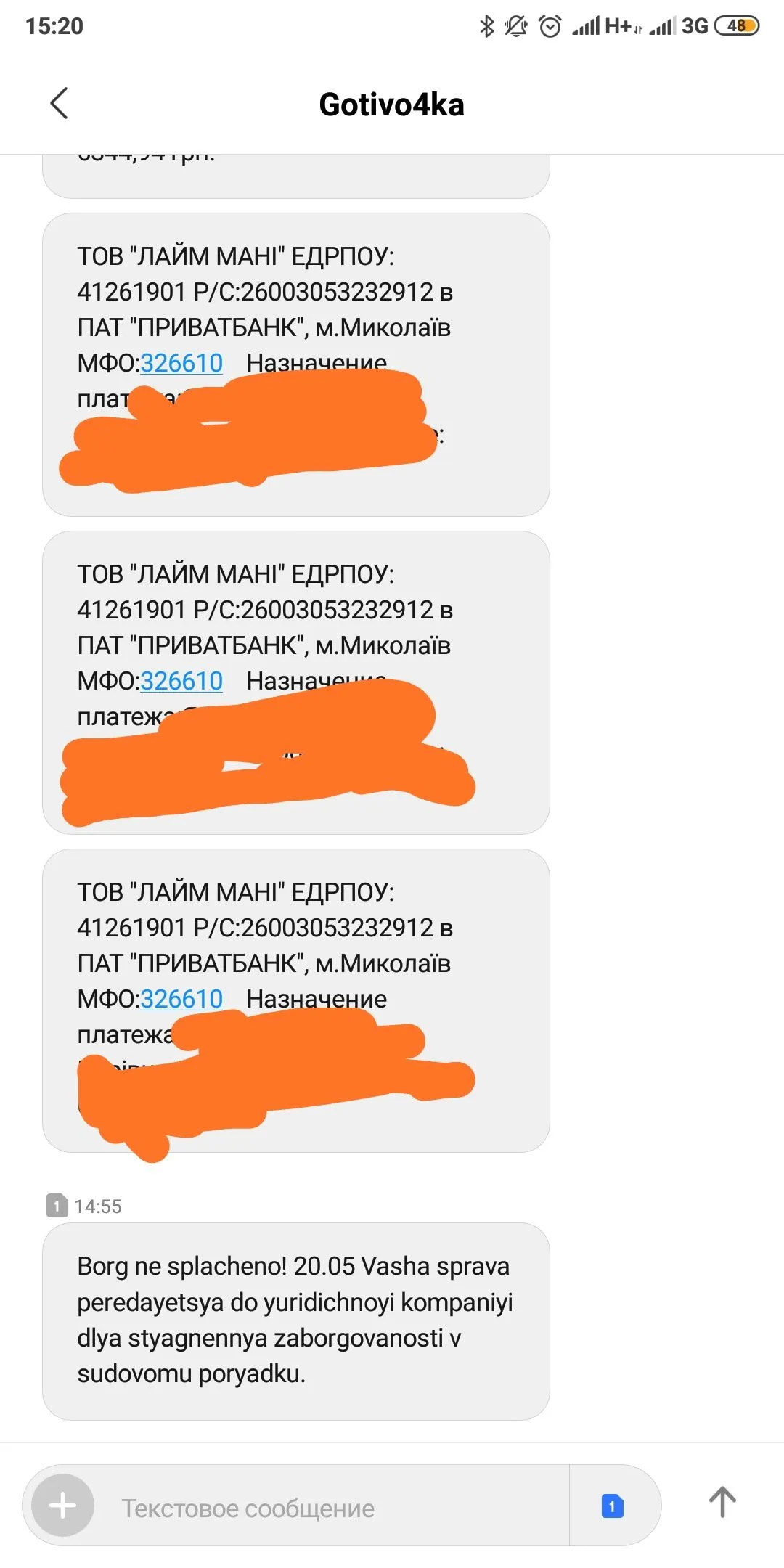 А сколько дней у вас просрочка? Мне сегодня 7 смс с реквизитами прислали а потом что передают для стягнення в судовому порядку... 3 раза обещали приехать...Пришло на имя мужа письмо от Лайм Мани досудебное требование. Кому ещё такое приходило? Что ждать?