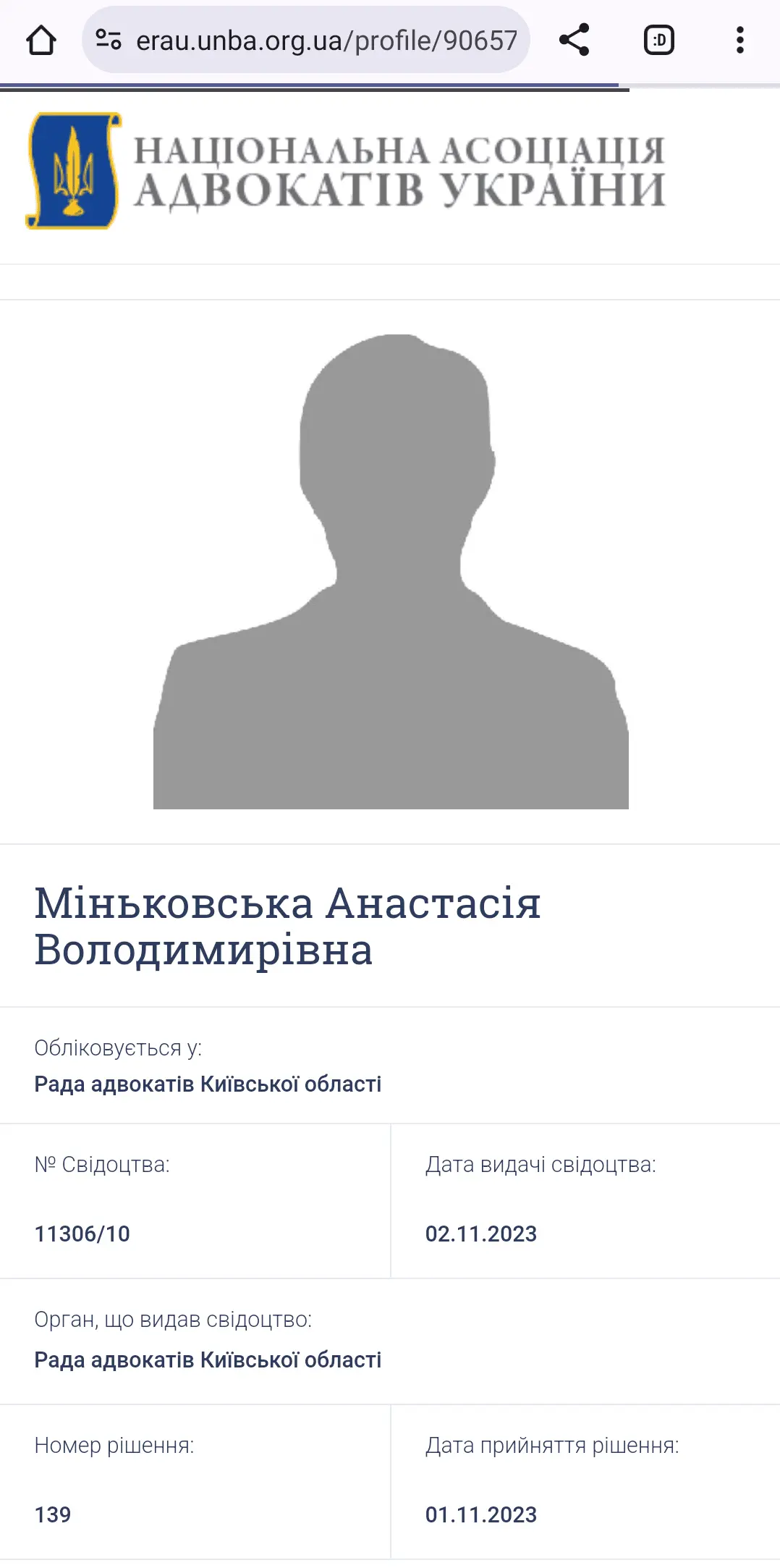 Хєрассє... отето поворотЦе не сайт Ради адвокатів м. Київа, Міньковська отримала свідоцтво адвоката 02.11.2023 р. та внесена до реєстру адвокатів 14.11. 2023 р. Радою адвокатів Київської області, а не міста Києва. Рада адвокатів м. Київа ніколи не видавала свідоцтво Міньковської