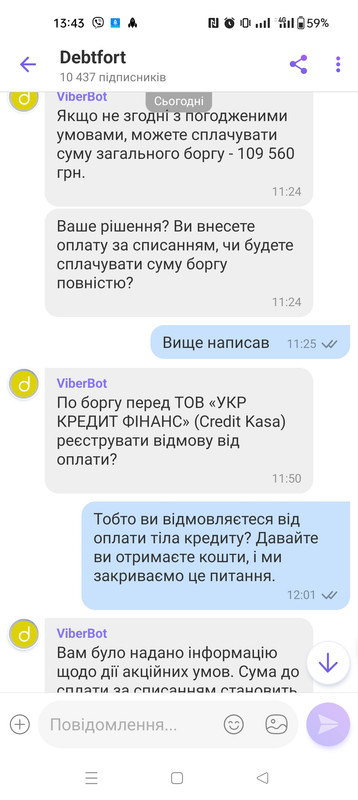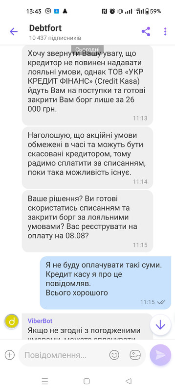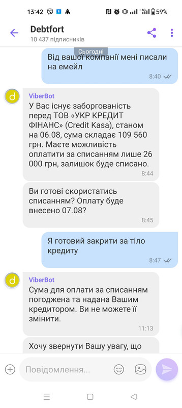 Найбільше вів переписки з Дебтфорд у яких кредит каса. При тілі 15000, є можливість закрити за 26. Згоди не доходимо.