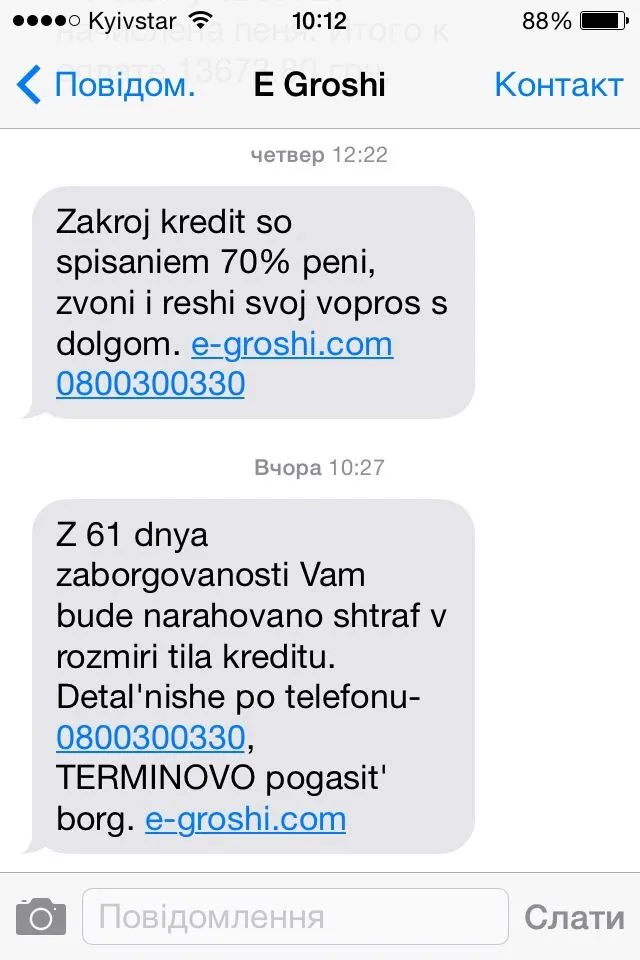 В мене теж з ними проблеми але тільки тіло буду платить,скажіть а родині вони звонили вашій бо мені на вайбер скидали дані моїх рідних такий собі Руслан,каже що буде з них спрос ,чи то тільки лякалкаПравда мені майже до 40000 тис. нарахували .А зариз приходять смс з 15000 тис. Тіпа списали чи що . Що хочуть те і роблять не вийшло з мене 40 000 тис. то пробують менше ( але всеодно не з моєю зарплатою в 3000 тис. їм платити).Тіло б і відсоток нашкребла щоб виплатити і відстали но не такі колосальні суми .