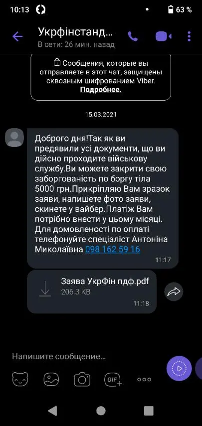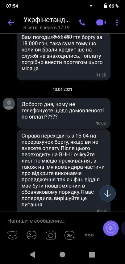 Во всяком случае все смс и письма приходили от имени Укрфинстандарт, предлагали написать заяву по форме, сбросить в вайтер и оплатить 5000 тела "в цьому місяці" смс біла датирована 15.03.21, потом в апреле написали почему не оплатили за договоренностью) и все пропали до прошлой недели, когда позвонили мне и вежливо предложили передать информацию о долге