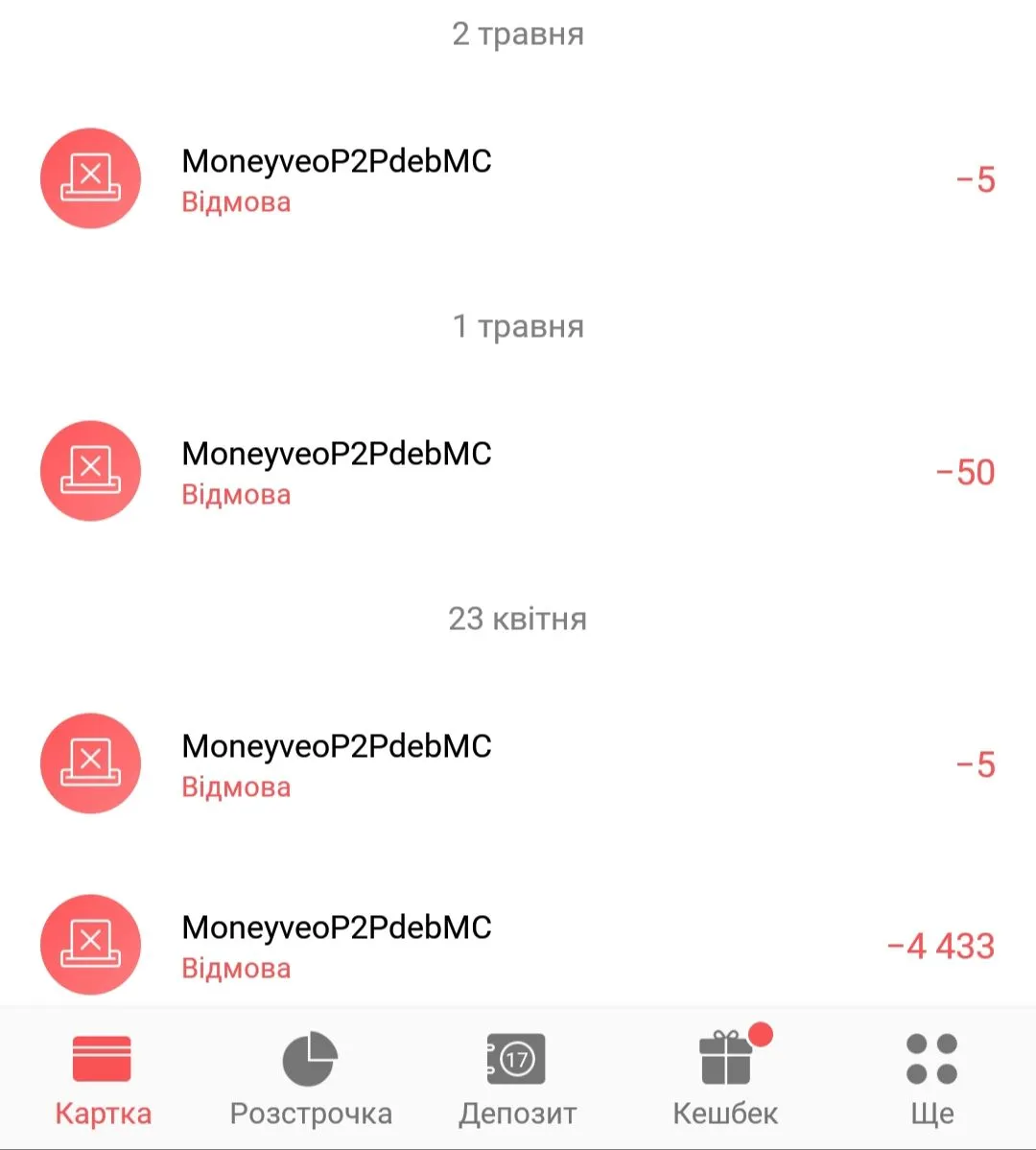 VIDMOVA. Nedostatno koshtiv. Perekaz z kartky