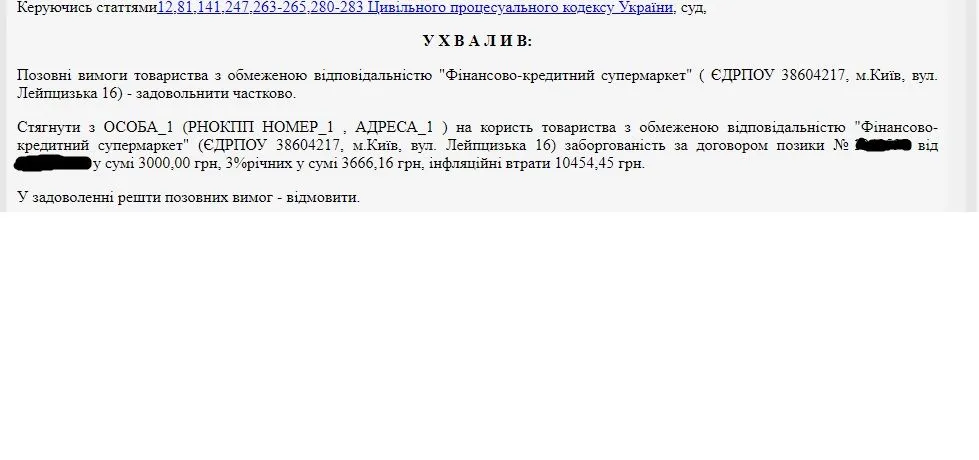 Доволі не поганий результат, як на мене.....хоча, в інший час, можна було б ще поборотись у апелляції, тому що суд якось трохи дивно застосував позовну давність, урізавши вимоги щодо інфляційних, 3% річних з урахуванням позовної давності, але чомусь залишив 3000 тіла кредиту((((