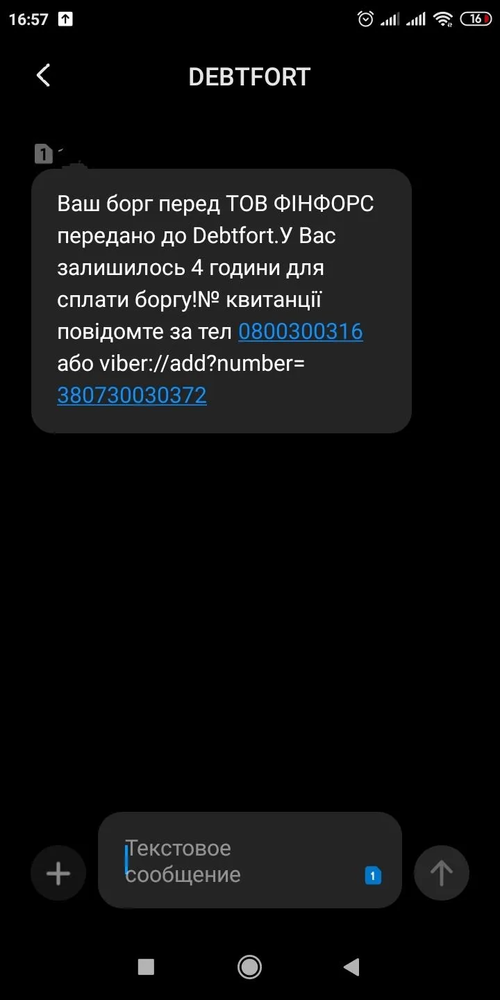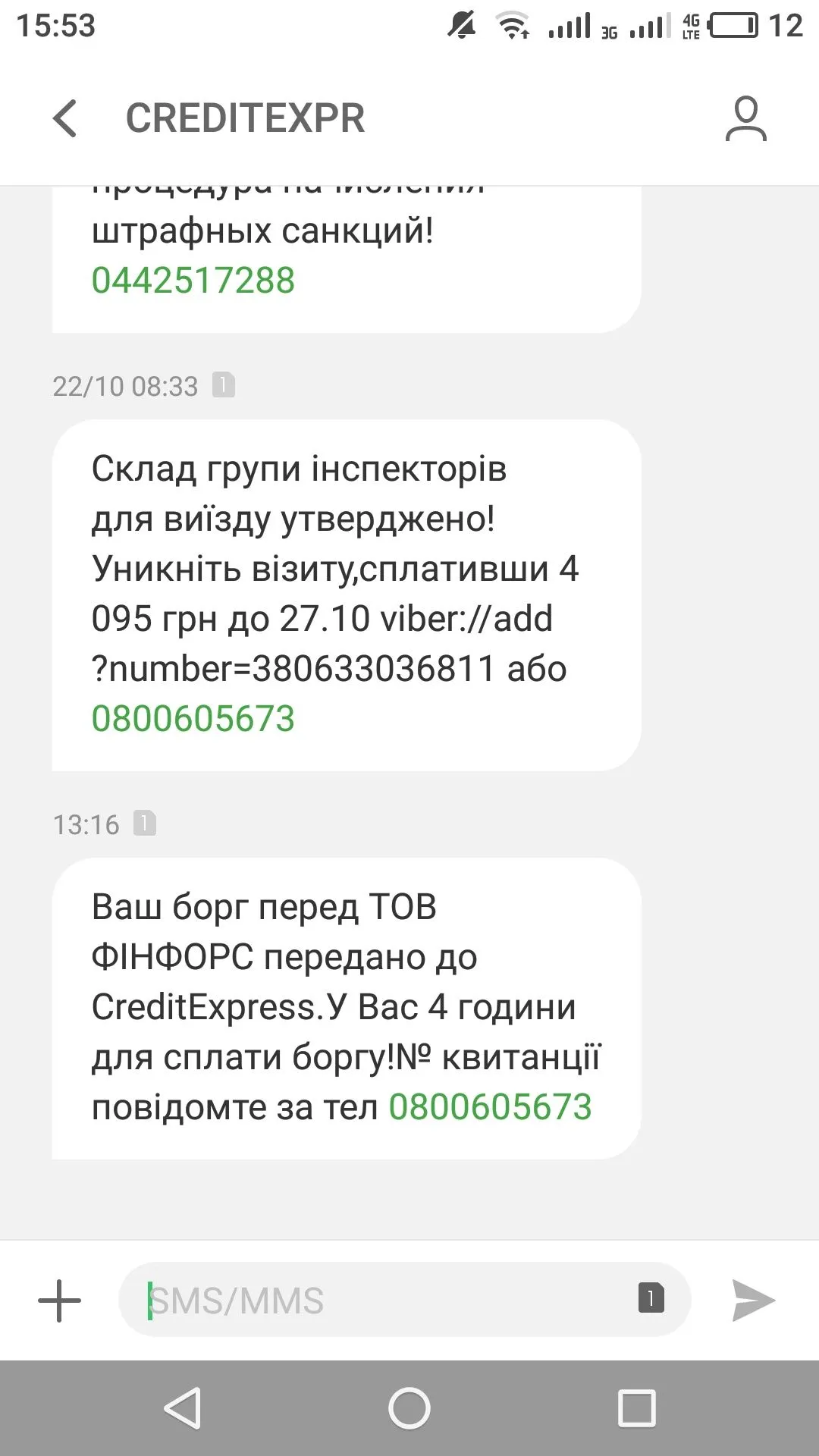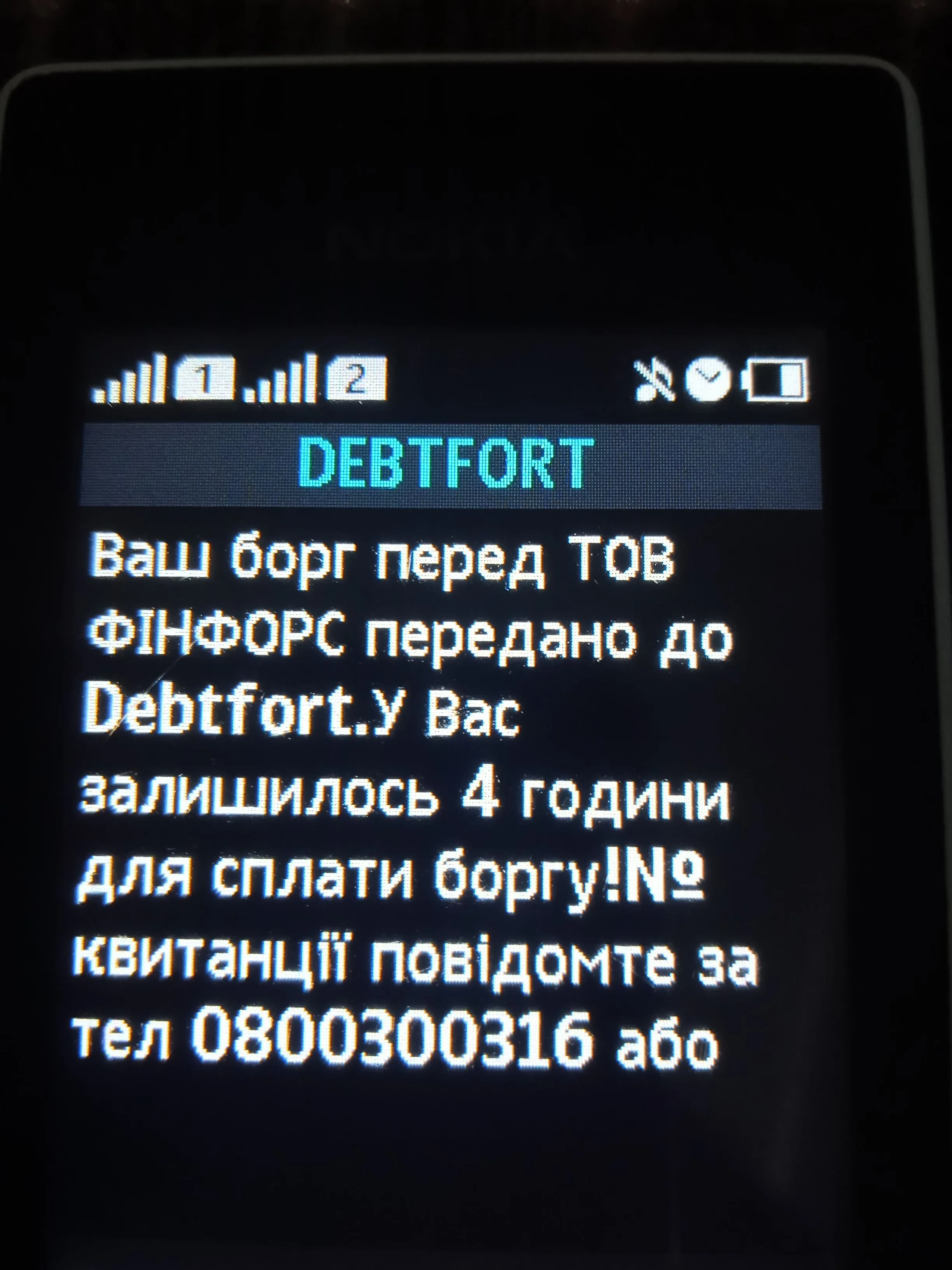 Ваш борг перед ТОВ ФІНФОРС передано до CreditExpress.У Вас 4 години для сплати боргу!№ квитанції повідомте за тел 0800605673