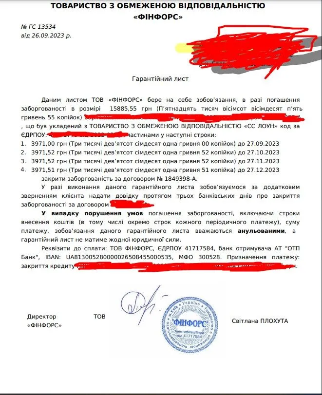 Доброго дня! Продали ФінФорс сслоун, тіло 15 855 грн, погодилися розбити на 4 платежі, вислали гарантійку на пошту електрону. Можна по ній платити? Прислали з пошти