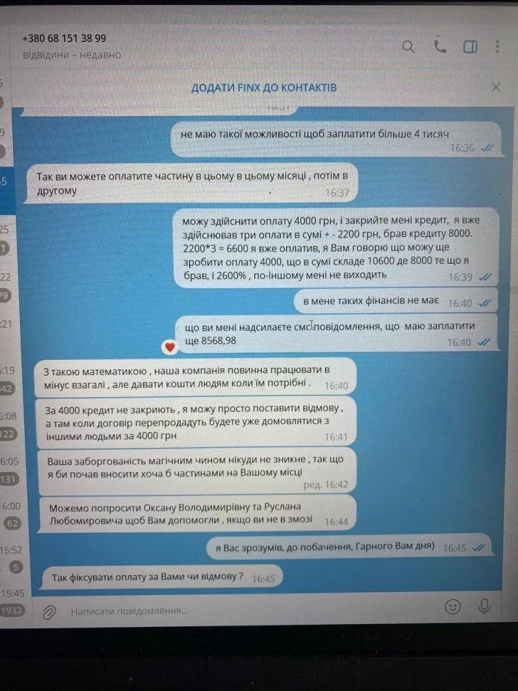 Кредит брав в FinX 02.02.2023 8000грн терміном на 4 місяці, здійснив 3 оплати, далі немає фінансів платити, так як ще є 13 МФО, прострочка по даному кредиту + - 1.5-2 місяці, сьогодні (17.05.2023) вирішив вийти з ними на зв'язок (скріншот переписки прикріпляю)